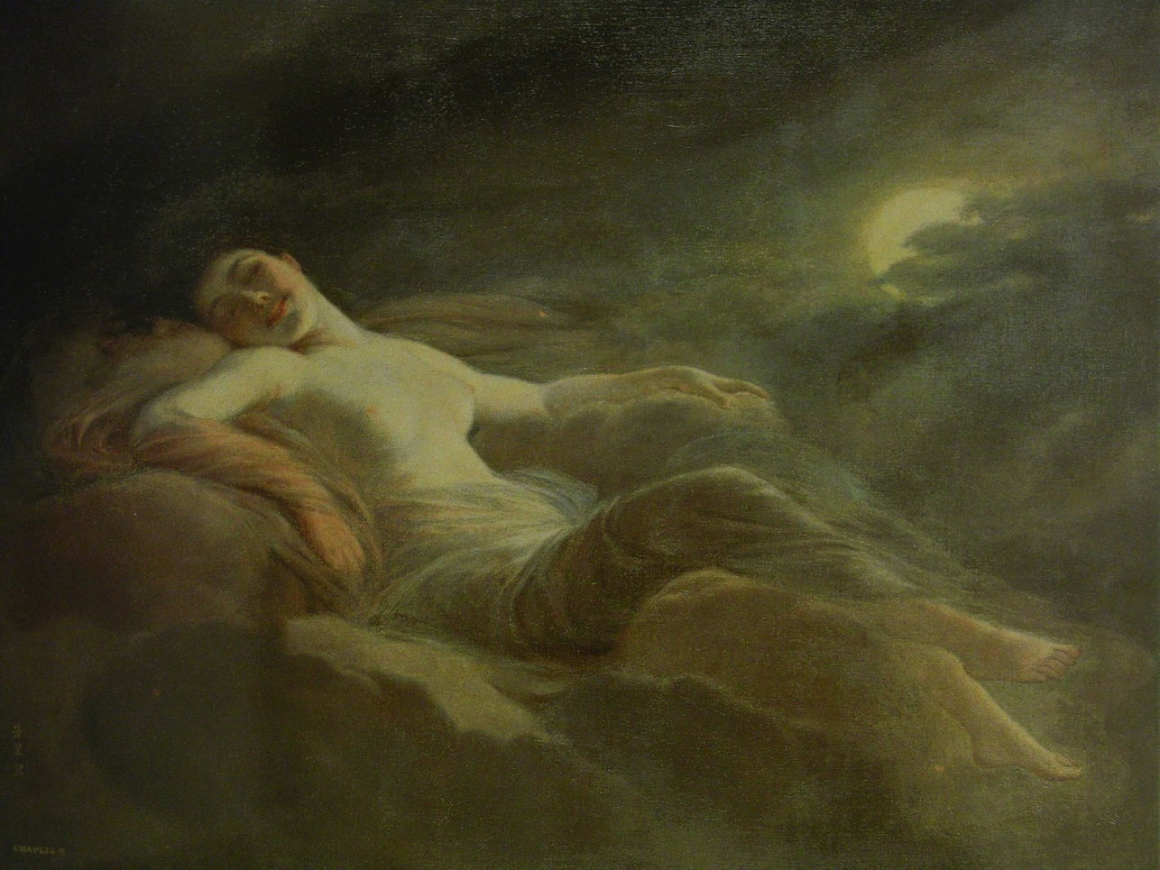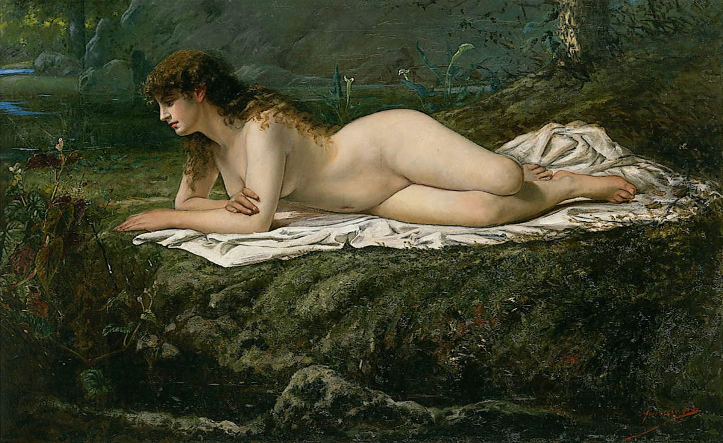 Trained first in the Nanga style, Yamamoto Hōsui (山本芳翠)(1850-1906) was taught by Charles Wirgman, Fontanesi, and under Léon Gérôme in Paris. Altogether he lived in Paris for over a decade, where he painted several female nudes, such as Rafu (裸婦) (1880) above, and Nude Woman under the Moon (月下の裸婦) (1882-6) below.