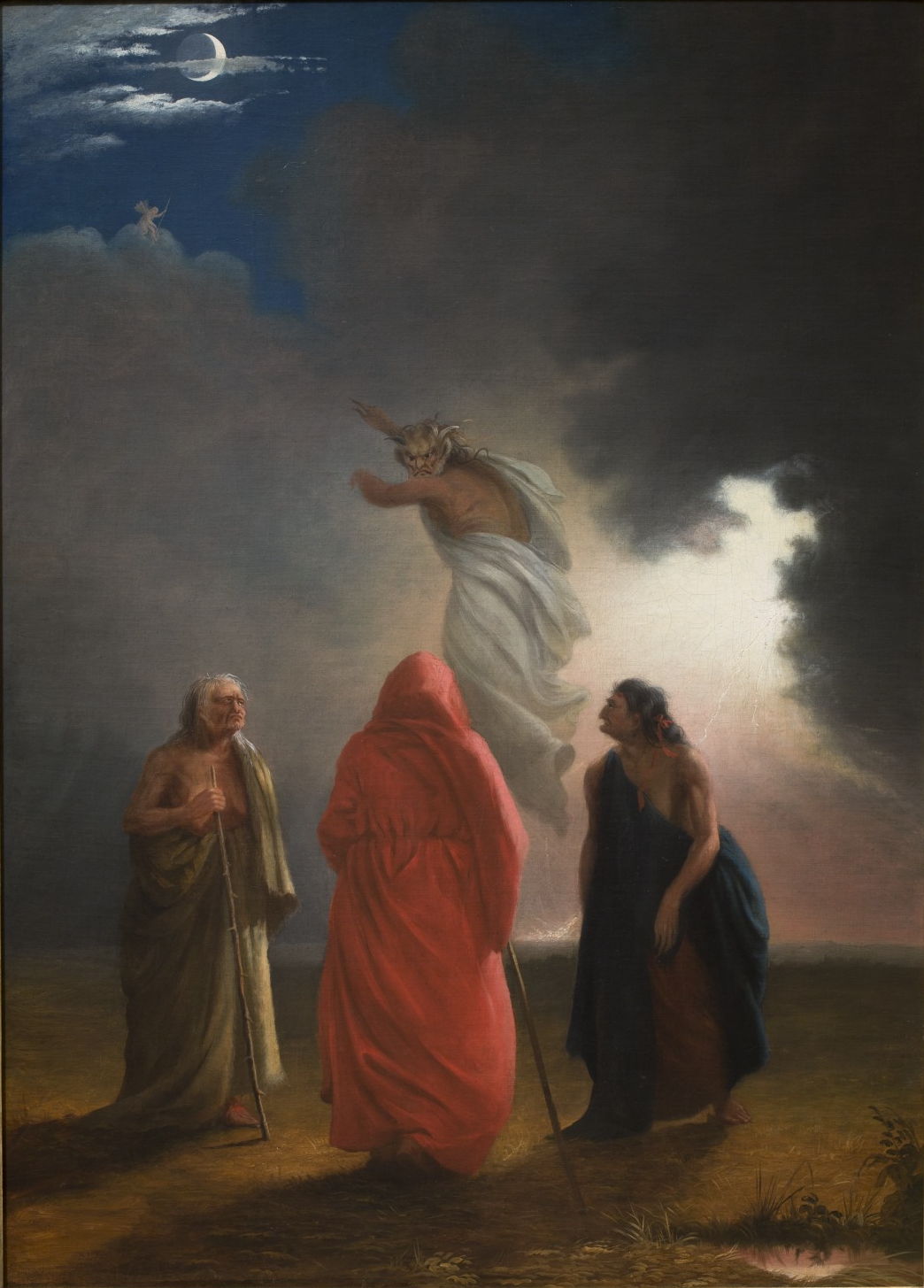 ThĂ©odore ChassĂ©riau’s Macbeth and Banquo Meeting the Witches on the Heath (1855) is a more conventional treatment, painted in the style of Delacroix.