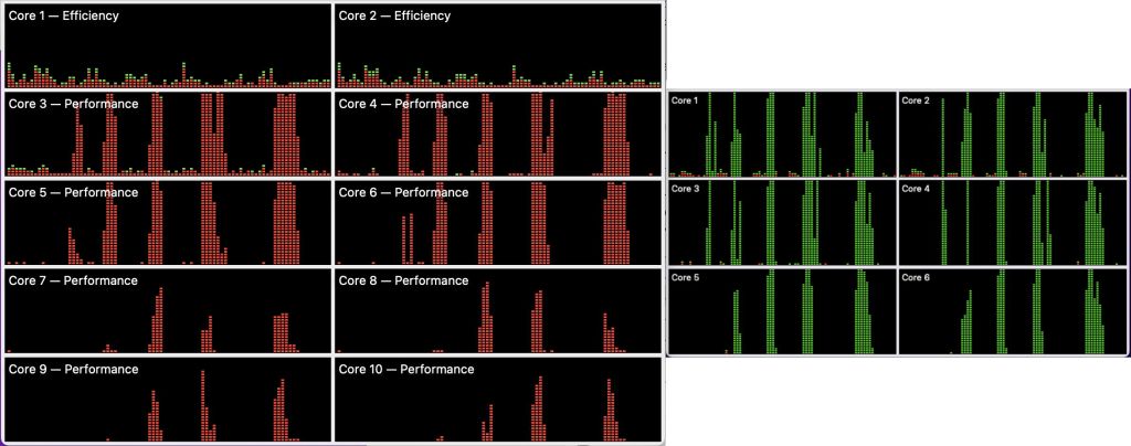 This contrasts markedly not only with Apple silicon chips, where low QoS elicits a very different pattern of core allocation, but even on Intel Macs, where low QoS results in constrained performance despite their cores being identical.