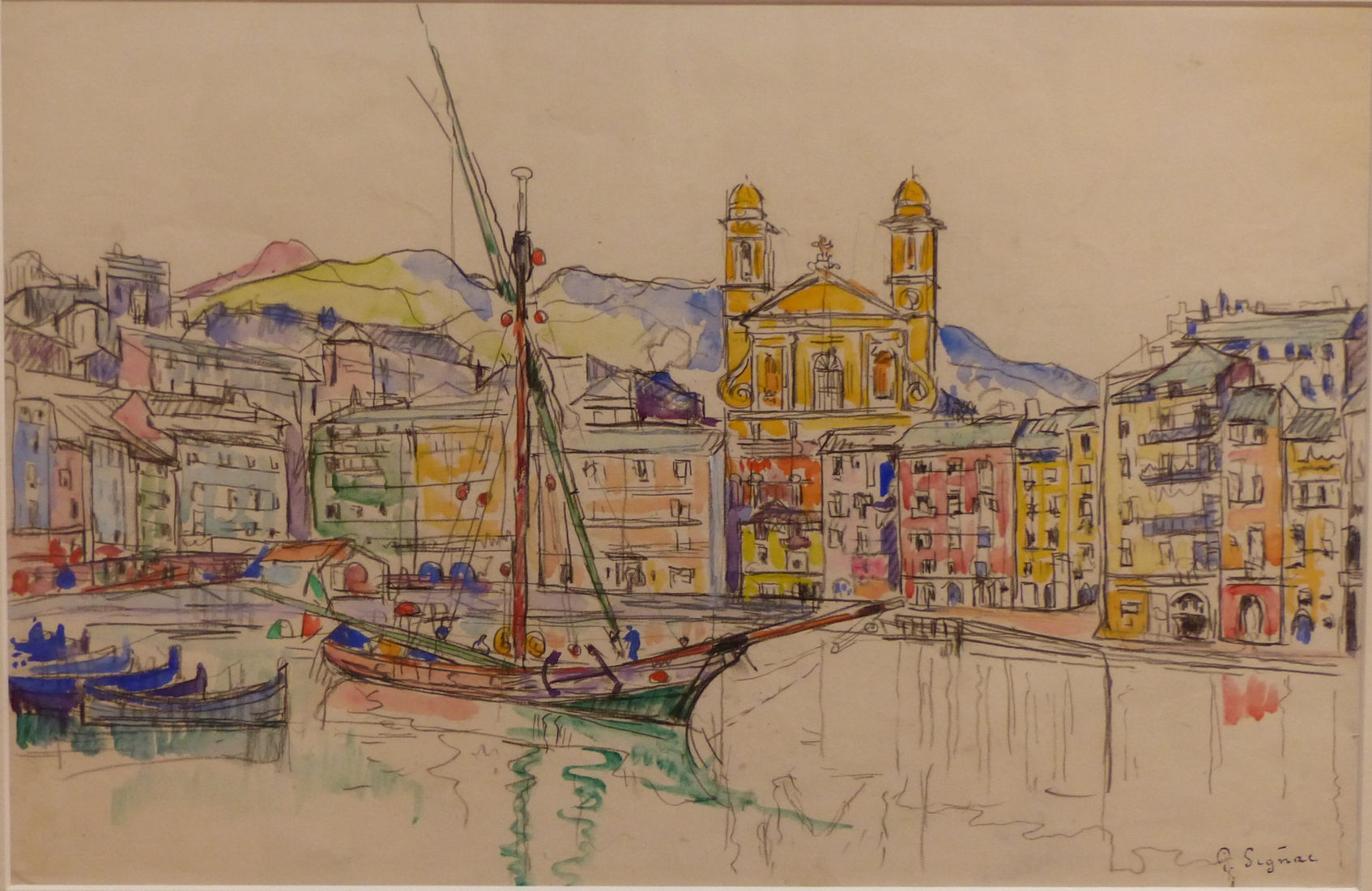 In 1935 Signac visited the French island of Corsica at last. After years of living in the Midi, the closest part of mainland France to this large island in the Mediterranean, he crossed by ferry and painted many watercolour views there.