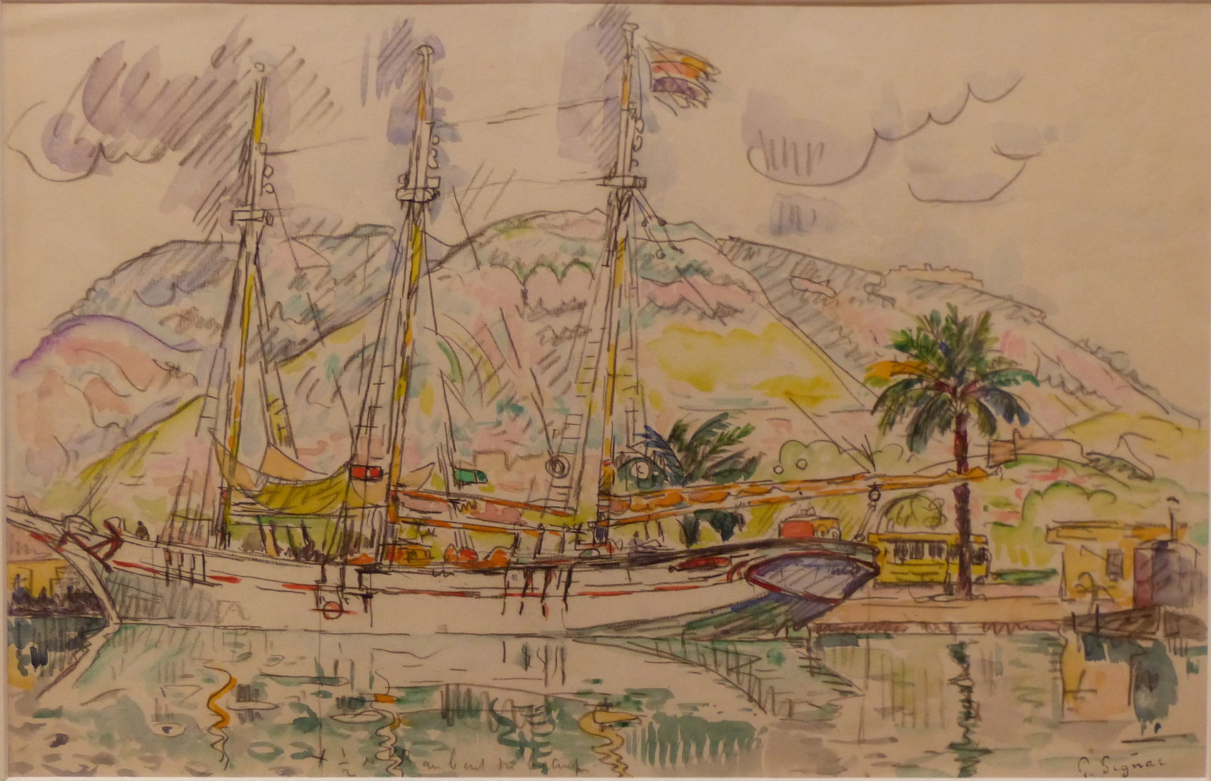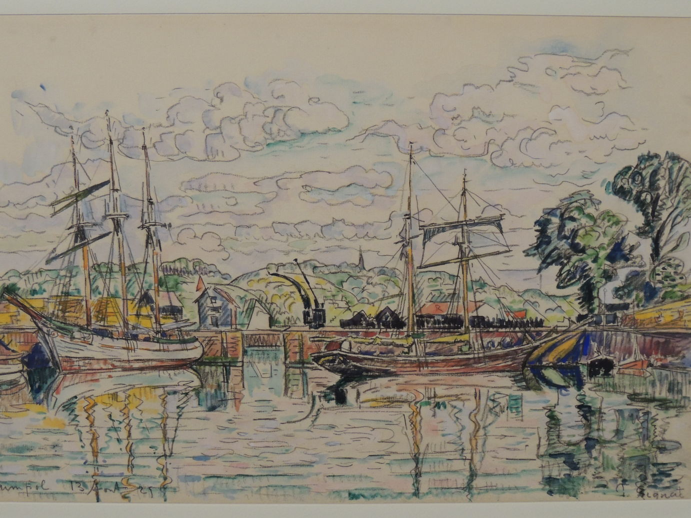 In 1925, Signac combined Conté crayon (a proprietary type of hard pastel) with watercolour to paint this view of Lézardrieux. This is a village at the far western end of the French Channel coast, and a popular port with yachtsmen. He appears to have sharpened the Conté crayon to use it to sketch the outlines before applying watercolour wash, in a manner not unlike the late watercolours of Paul Cézanne.