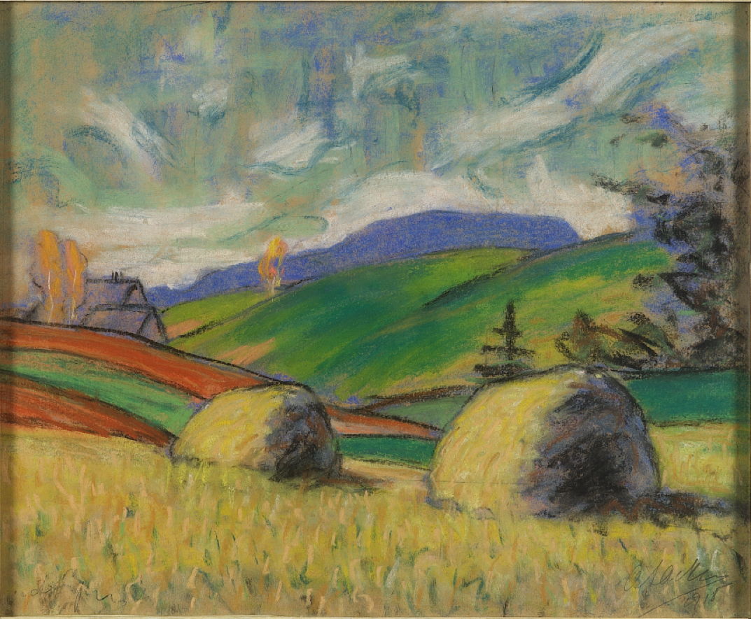 Late in the summer of 1915, he painted this Landscape with Grain Fields with its unusual gold and green clouds echoing the land below them.