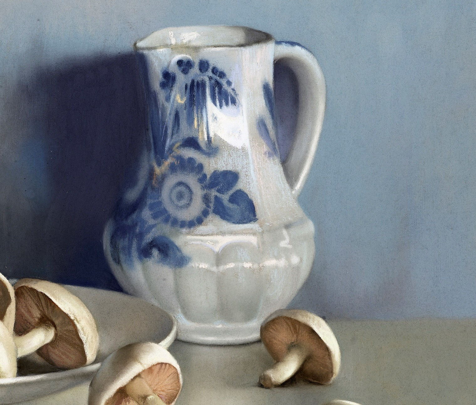 Firmin Baes (1874–1943), Still Life with Mushrooms and a Pitcher (detail) (c 1935), pastel on canvas, 59 x 79 cm, location not known. Image by Stephen Ongpin Fine Art, via Wikimedia Commons.