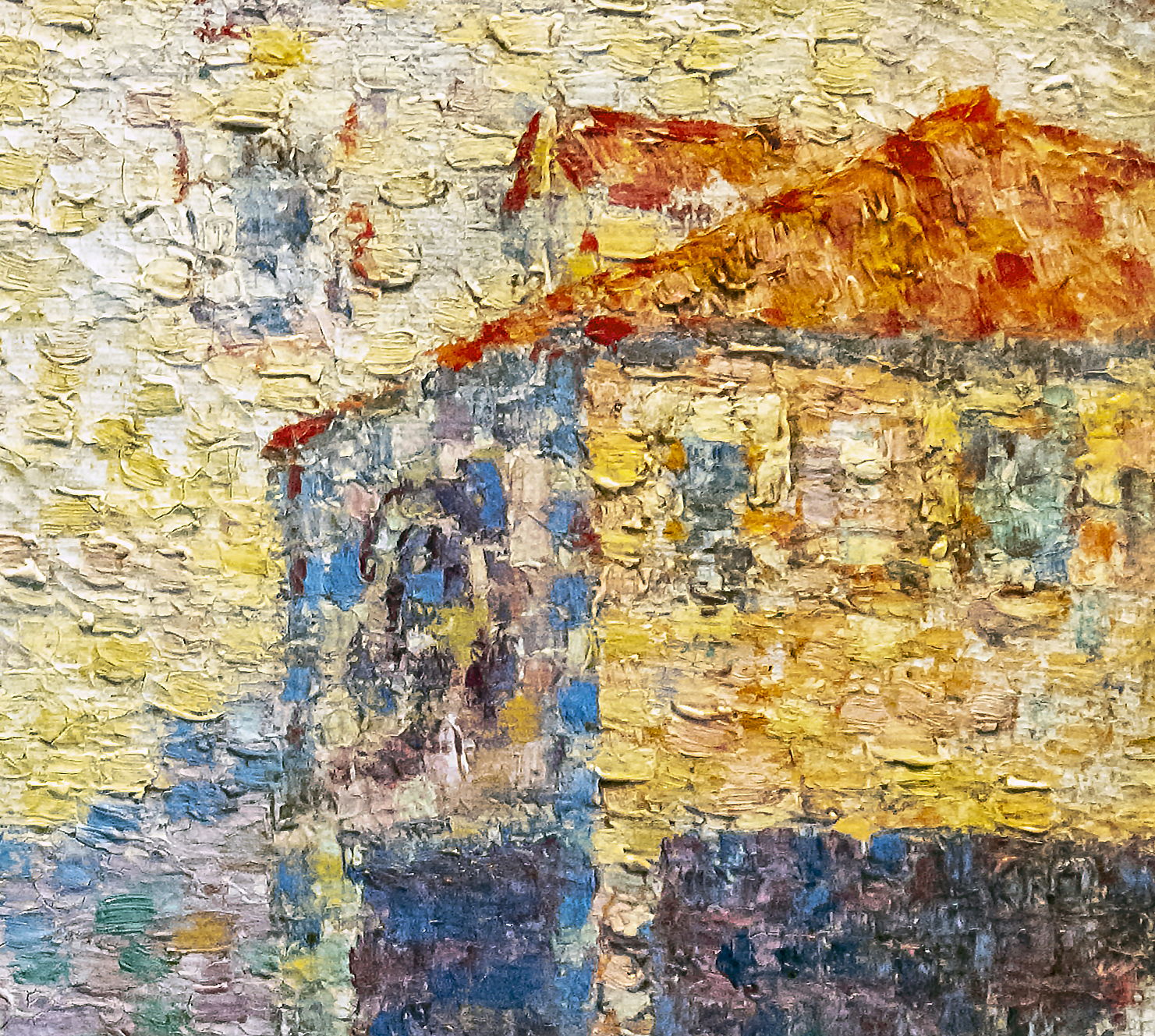 The detail below shows his use of contrasting colour in the tiny dots of paint, where he superimposes orange over a dark blue, and pale blue over yellow ochre, for instance. In addition to their simultaneous contrasts, these unify one passage with another, giving harmony of appearance. He also tended to place his paint dots in rows, giving rise to linear stippling in the water.