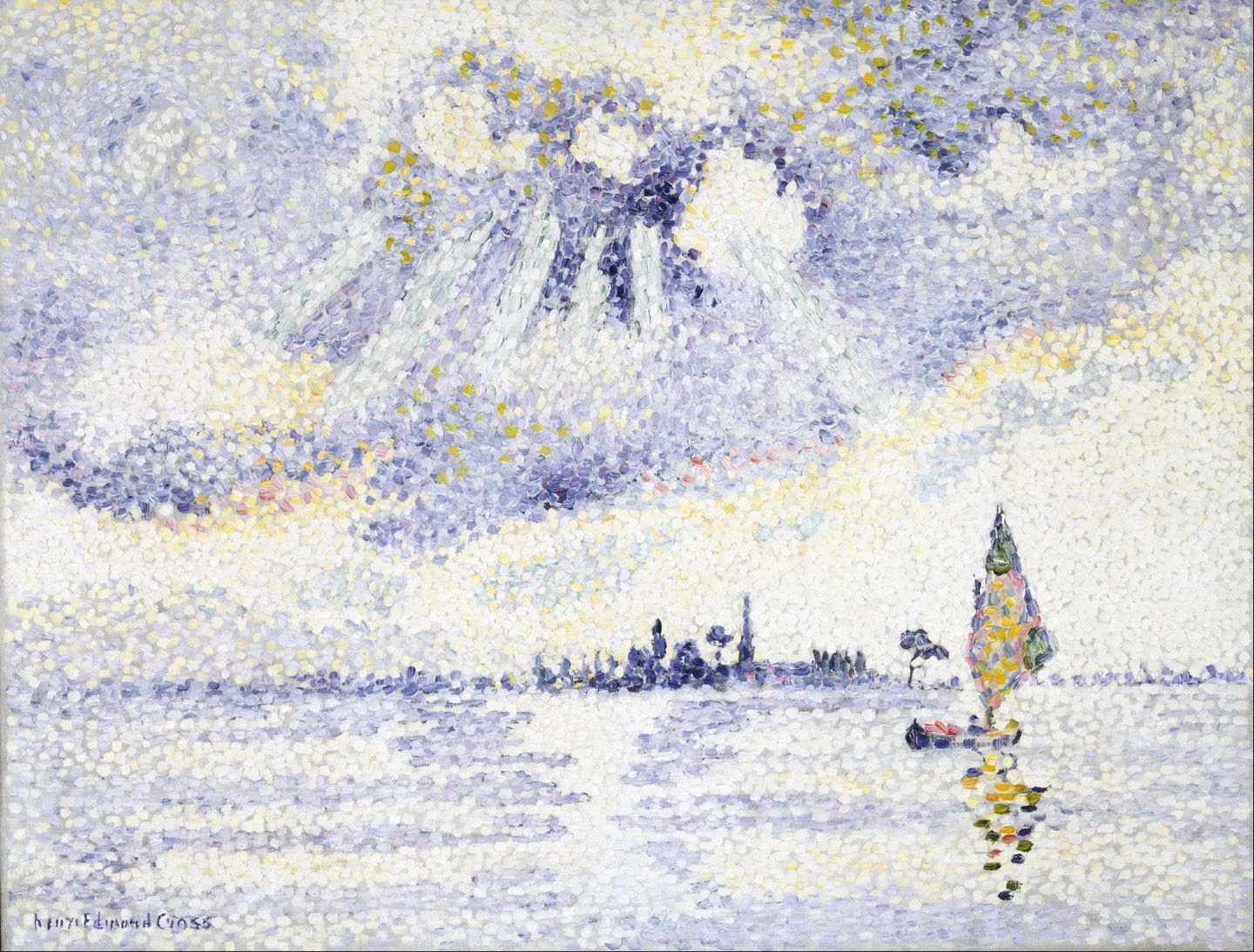 By the following year, Cross had turned the chroma up further in this Sunset over the Sea (1896). His marks have now changed from dots to coarser tiles of colour, which fuse in impasto in the sky.