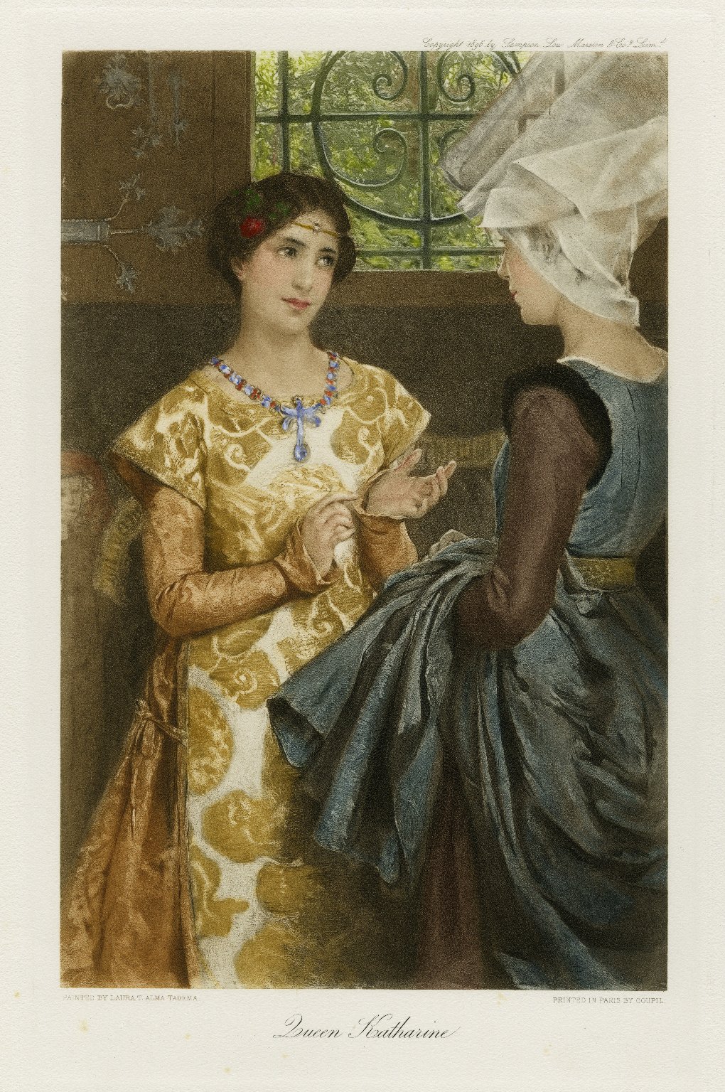 This painting, by Laura Theresa Alma-Tadema, wife of the more famous Lawrence, is a portrait of Queen Katharine published in The Graphic Gallery of Shakespeare’s Heroines in 1896.