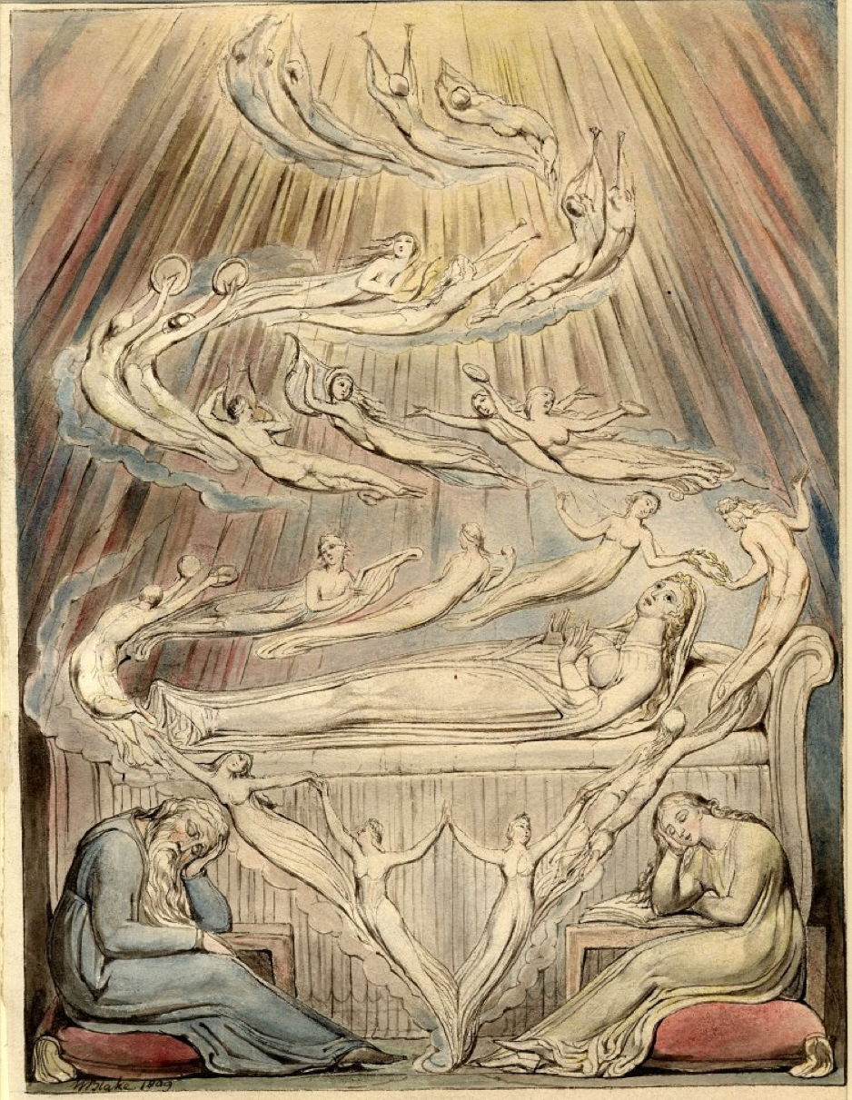 In about 1825, Blake used pen and ink with watercolour to paint his second version.