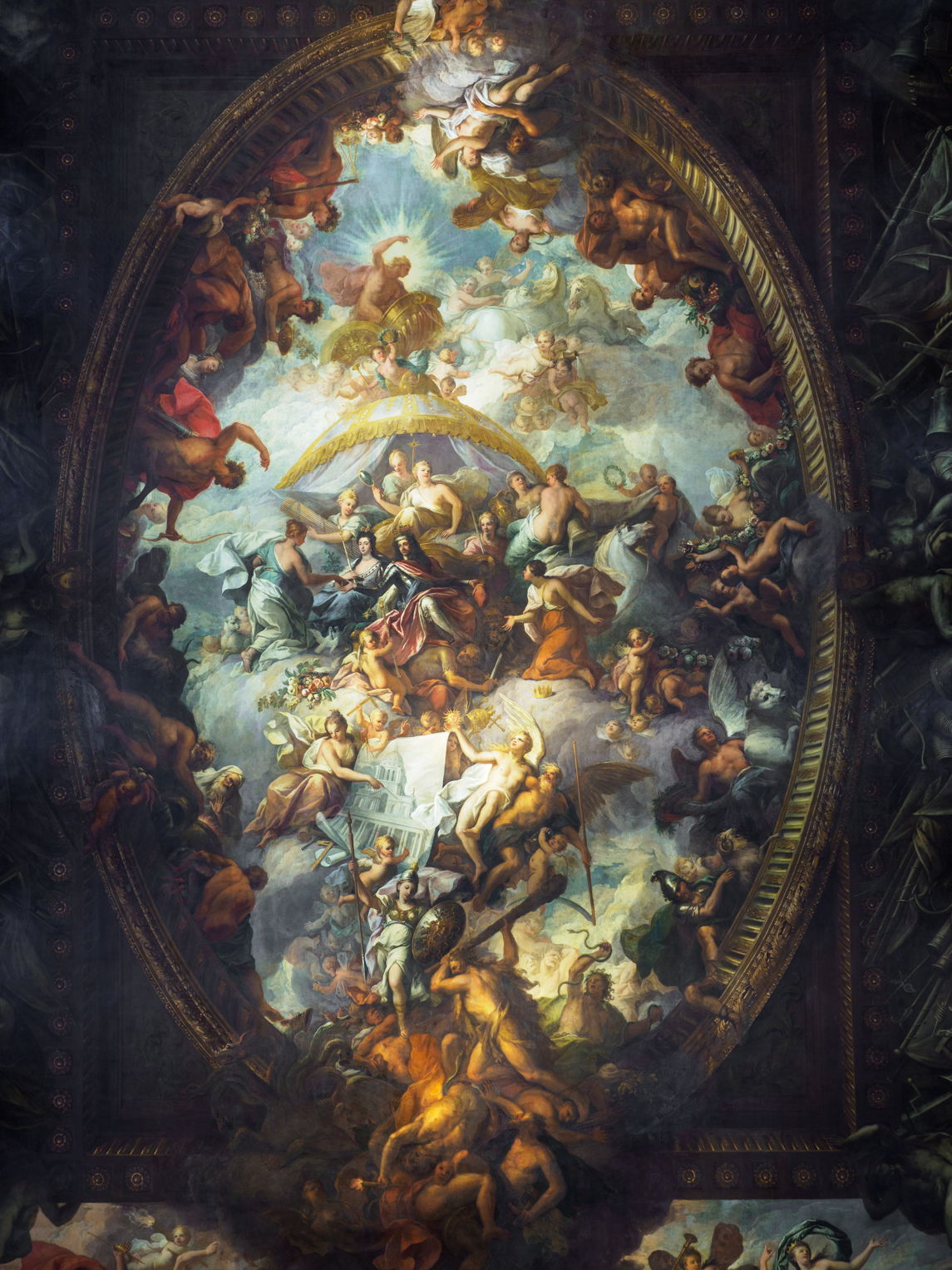 James Thornhill (1675–1734), Triumph of Peace and Liberty over Tyranny (detail) (1708–1712), ceiling in the Lower Hall, Painted Hall, Greenwich Hospital, London. Image by Ravi, via Wikimedia Commons.