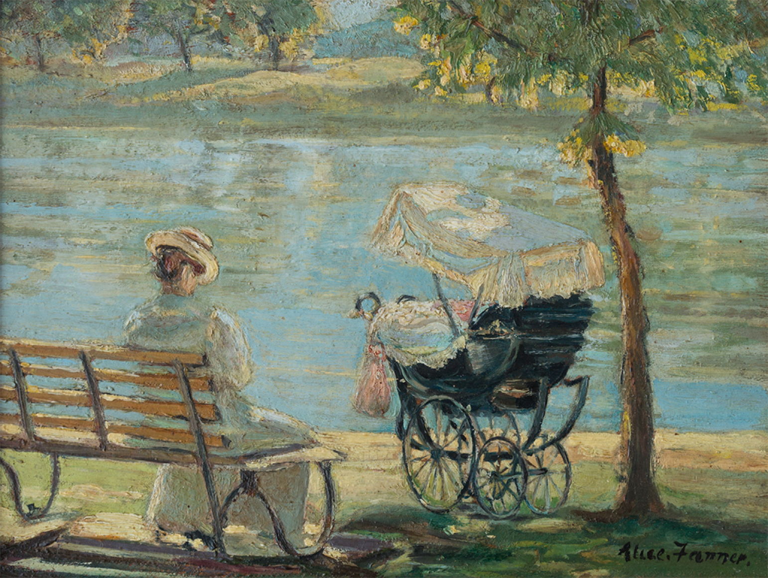 Summer Morning – Datchet shows a young woman with a baby in a pram on the bank of the River Thames.