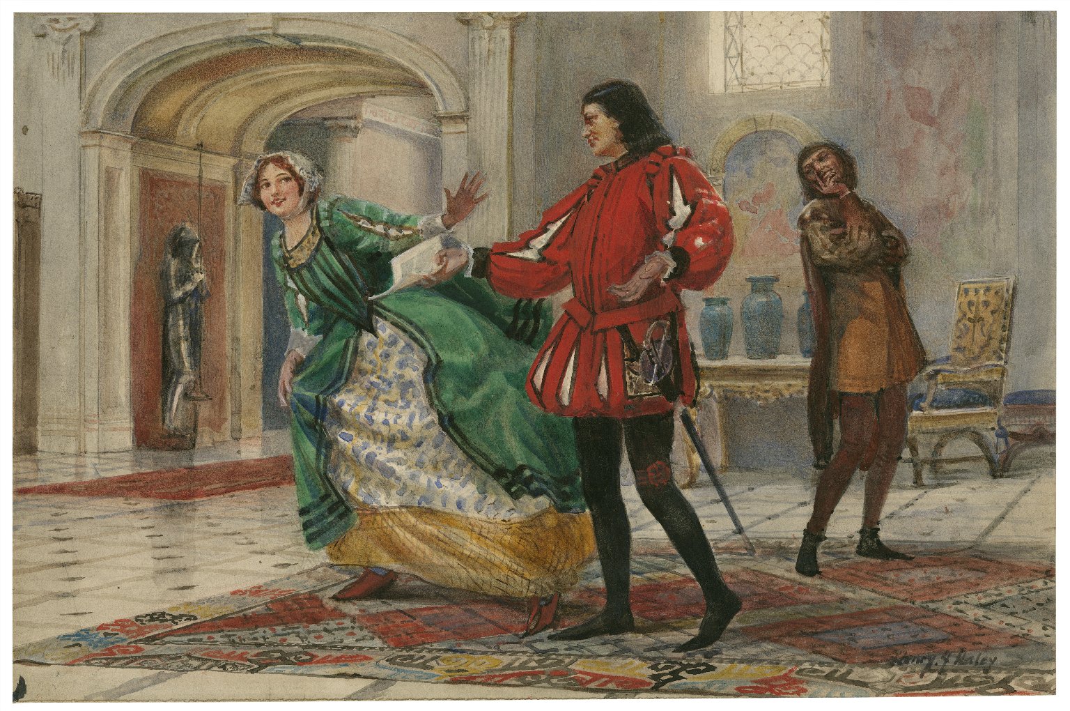 Proteus and Julia exchange rings as tokens of their faithfulness to one another before he departs for Milan, with his servant Lance and his dog Crab. When Proteus arrives in the Duke’s court, Valentine explains his plan for him to elope with Silvia, but once Proteus is alone he admits that he too has fallen in love with her, and decides to reveal Valentine’s intended elopement so that his friend is banished from court and he can press his own suit for the Duke’s daughter without serious opposition.
