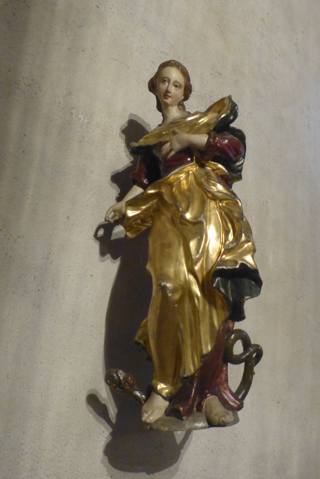 This example of Our Lady of the Angels from Sineu on Mallorca features a bronze-coloured serpent with an apple stuck in its mouth, and one of Mary’s feet resting on it in her triumph over Original Sin.