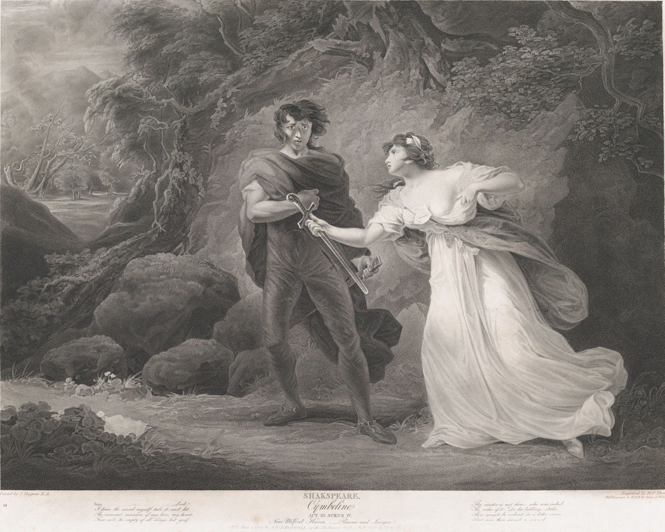 This engraving of John Hoppner’s painting of Pisanio and Imogen was made in 1801 for Boydell’s Shakespeare Gallery prints. Imogen is handing Pisanio a sword with which to kill her.