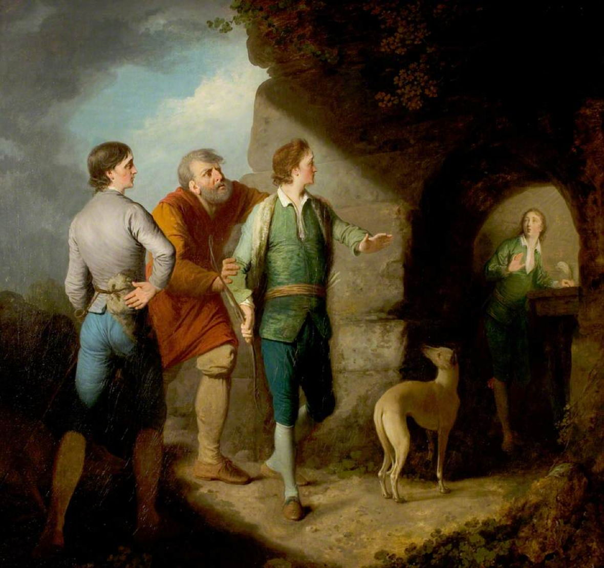 Edward Penny’s Imogen Discovered in the Cave from about 1770 is slightly incongruous, showing Belarius and the two sons outside the cave, and Imogen standing inside.