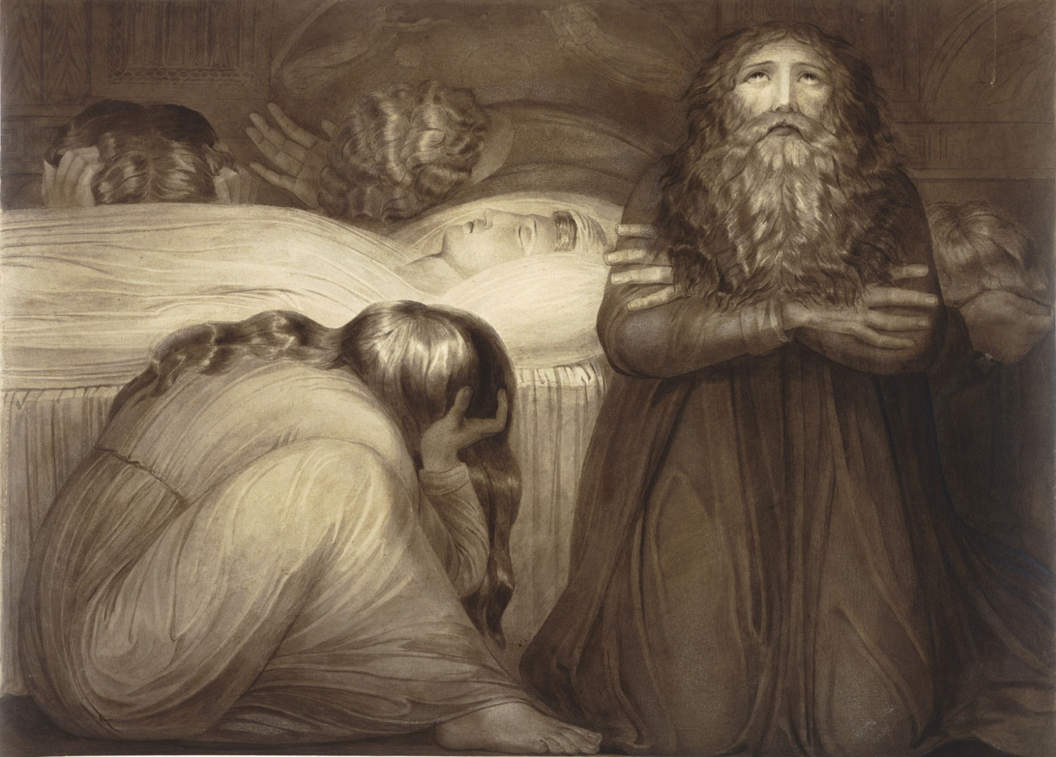 One of his last glue tempera paintings, Count Ugolino and His Sons in Prison (c 1826) shows a complex episode from Dante’s Inferno Cantos 32 and 33, of a nobleman accused of treason. Thrown into prison for his alleged crime, Ugolino and his sons were starved to death, a scene previously shown in a painting by Fuseli in 1806.