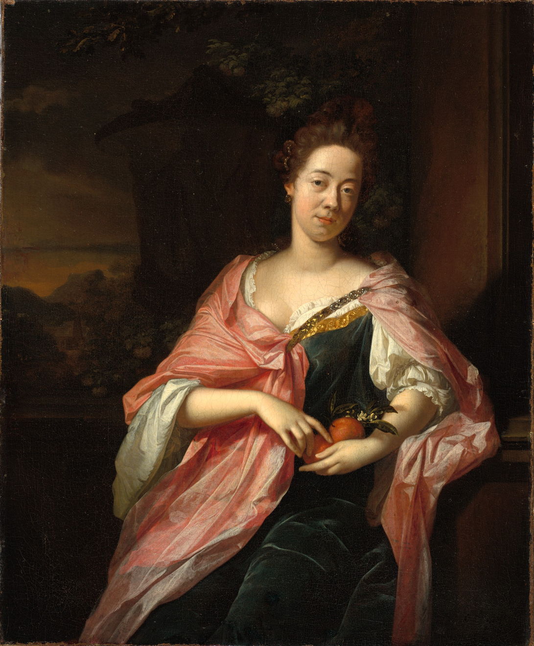 Van der Werff’s rendering of textiles in this Portrait of the Artist’s Wife, Margareta Rees from 1698 is also exceptional, although I’m not sure what she is holding in her hands, which appears to be a vegetable from the darkened garden behind her.
