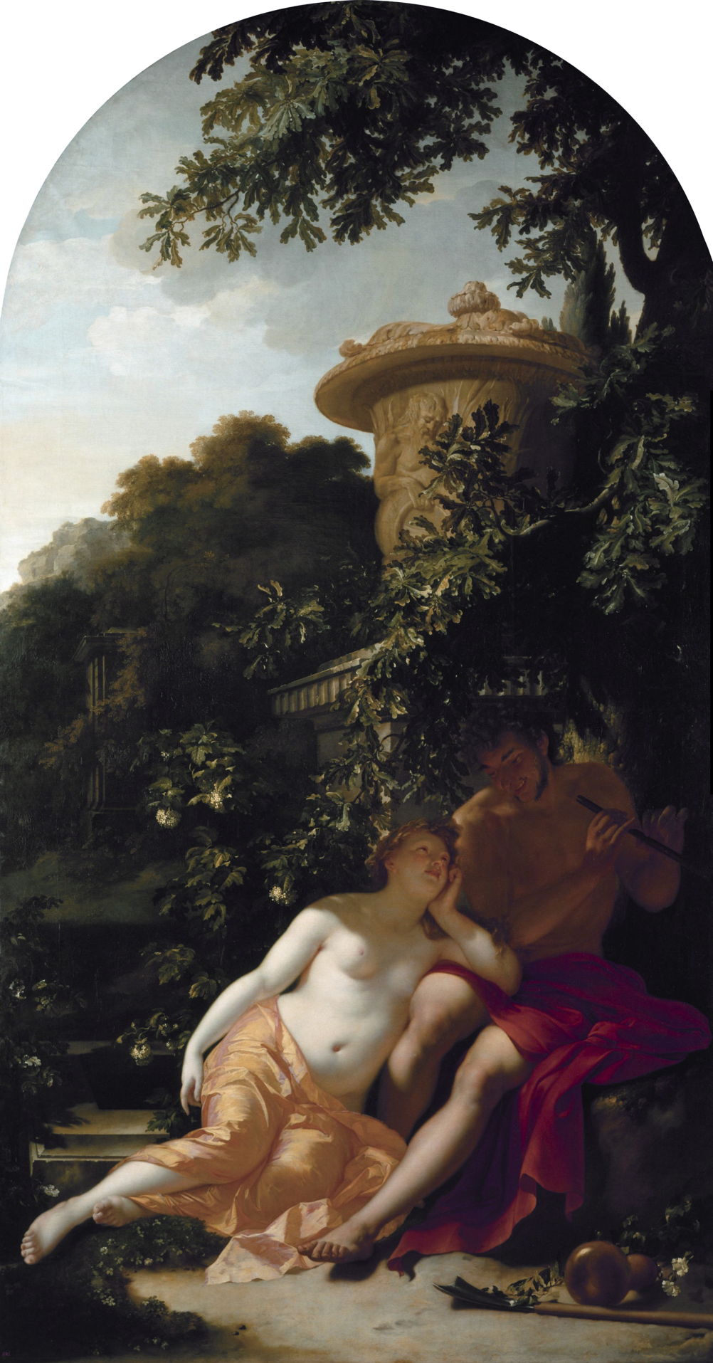 Van der Werff’s modern reputation includes painting the erotic, and his Amorous Couple in a Park Spied upon by Children, or Paris and Oenone, from 1694, is one of his earlier works exploring the intense relationship of this legendary couple. As a shepherd, Paris of Troy went everywhere with his pipes, here depicted as an instrument resembling a modern recorder. His first marriage was to the nymph Oenone, whom he later abandoned to marry Helen.