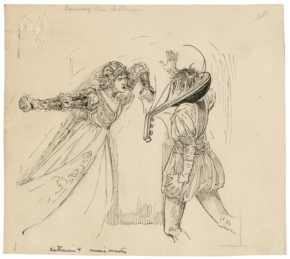 Louis Rhead’s wonderful ink drawing of Katherine Breaking a Lute Over Hortensio’s Head was made in about 1918 for an illustration in Lamb’s Tales.