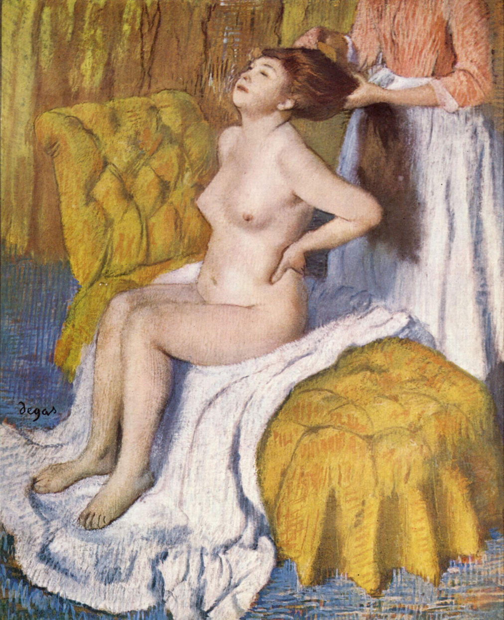 As an alternative, this pastel of a Woman Having Her Hair Combed from ten years later shows a maid doing the same task. The woman sits upright, her head thrown back, hands on her hips, and eyes closed, as she enjoys the frisson of her maid’s combing.