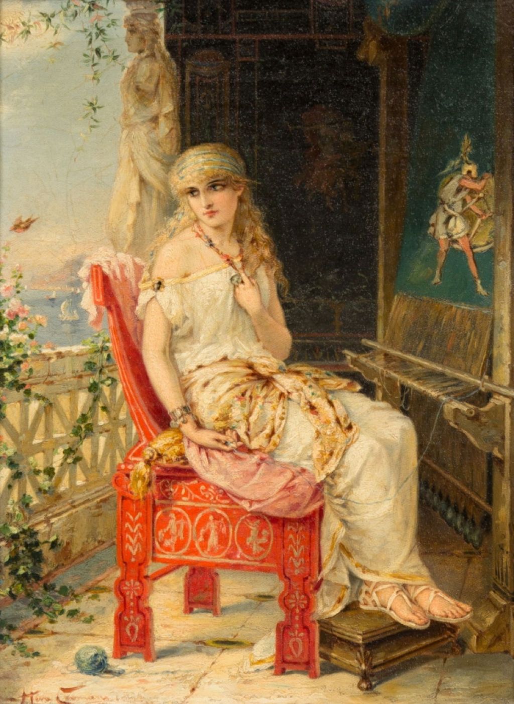 For Heva Coomans, Penelope Awaiting Odysseus (c 1900) is weaving an image of her husband as warrior, celebrating the victory at Troy. She pauses to look over her shoulder in the hope that the sails of his ships might appear any minute now.