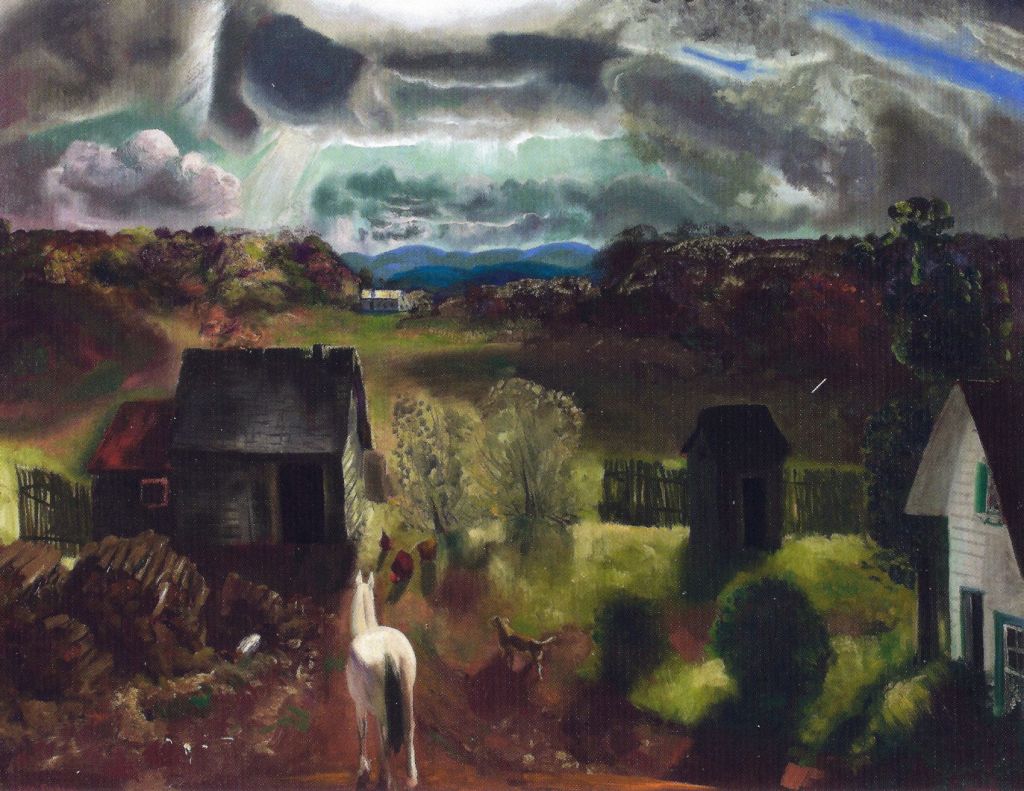George Bellows painted The White Horse on a farm near Woodstock, New York. Seen in the late fall colours of November, the scene is heightened by the light cast through broken shower clouds, making the white horse look almost supernatural.