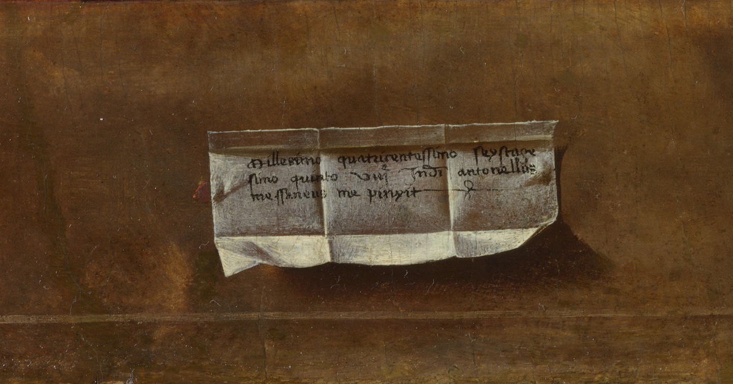 Many of Antonello da Messina’s groundbreaking oil paintings include his cartellino. In the case of his magnificent Saint Jerome in his Study from around 1475, he places it in a position of prominence, close to the centre, stuck to the wooden panel on the side of the saint’s desk. But seen in detail (below) this may actually be a dummy, with unreadable text.
