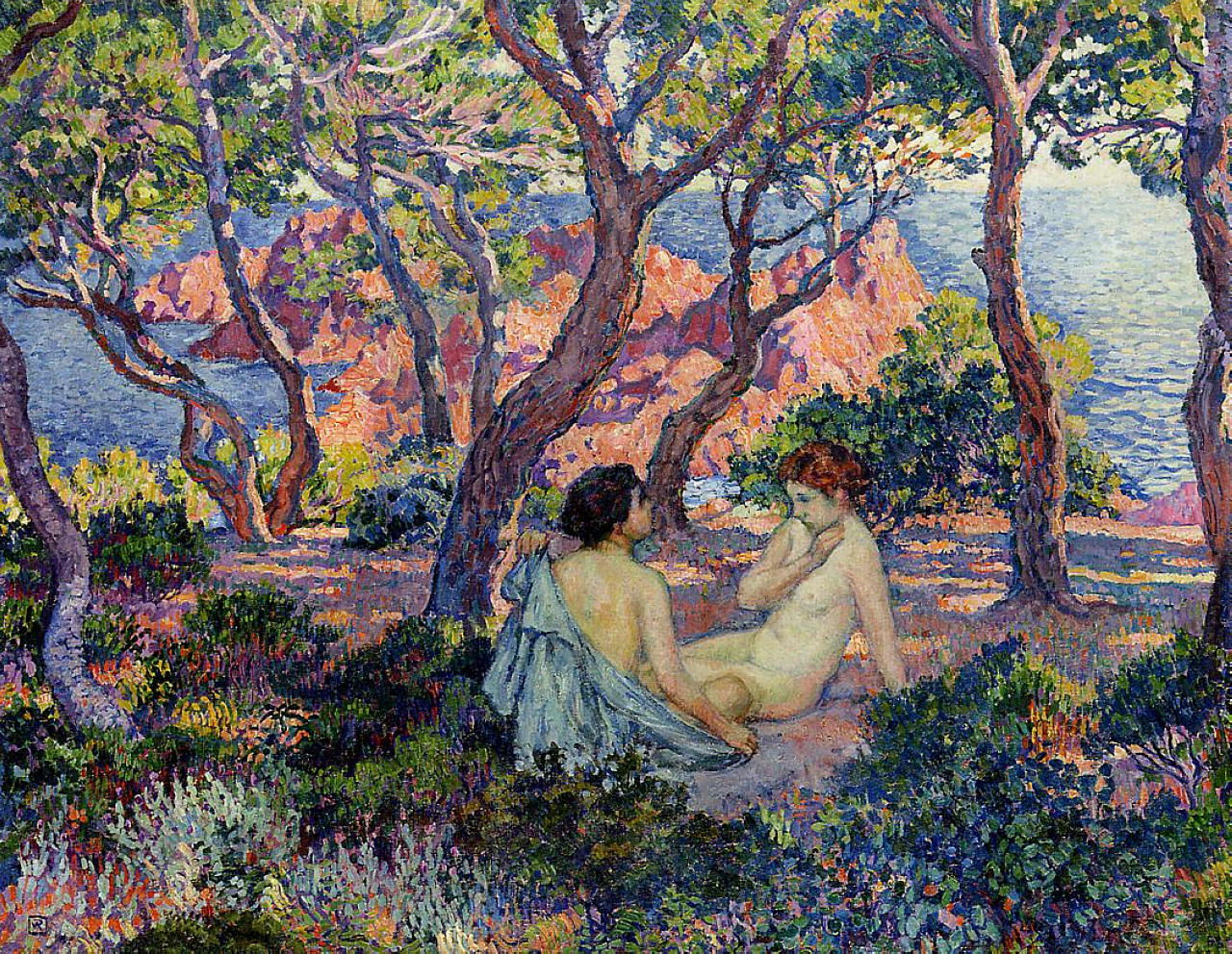 Bathers under the Pines at Cavalière (1905) shows another pines-beach-bathers motif, with a different intermediate style between Neo- and Post-Impressionism, and the heightened colours of his later works.