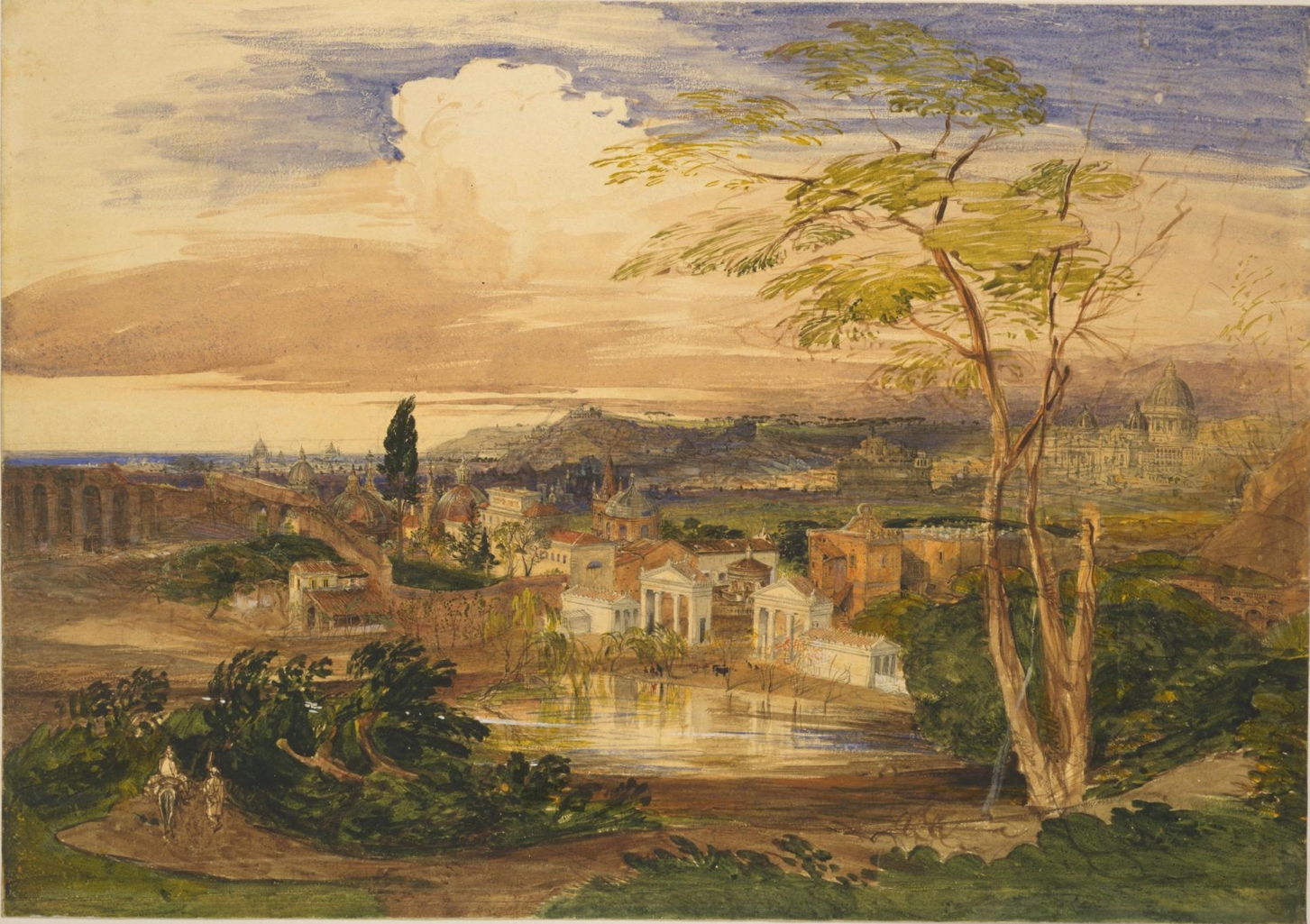Palmer’s paintings made during his extended honeymoon vary in their quality. Rome from the Borghese Gardens (1837) is one of his better watercolours from his stay in the city.