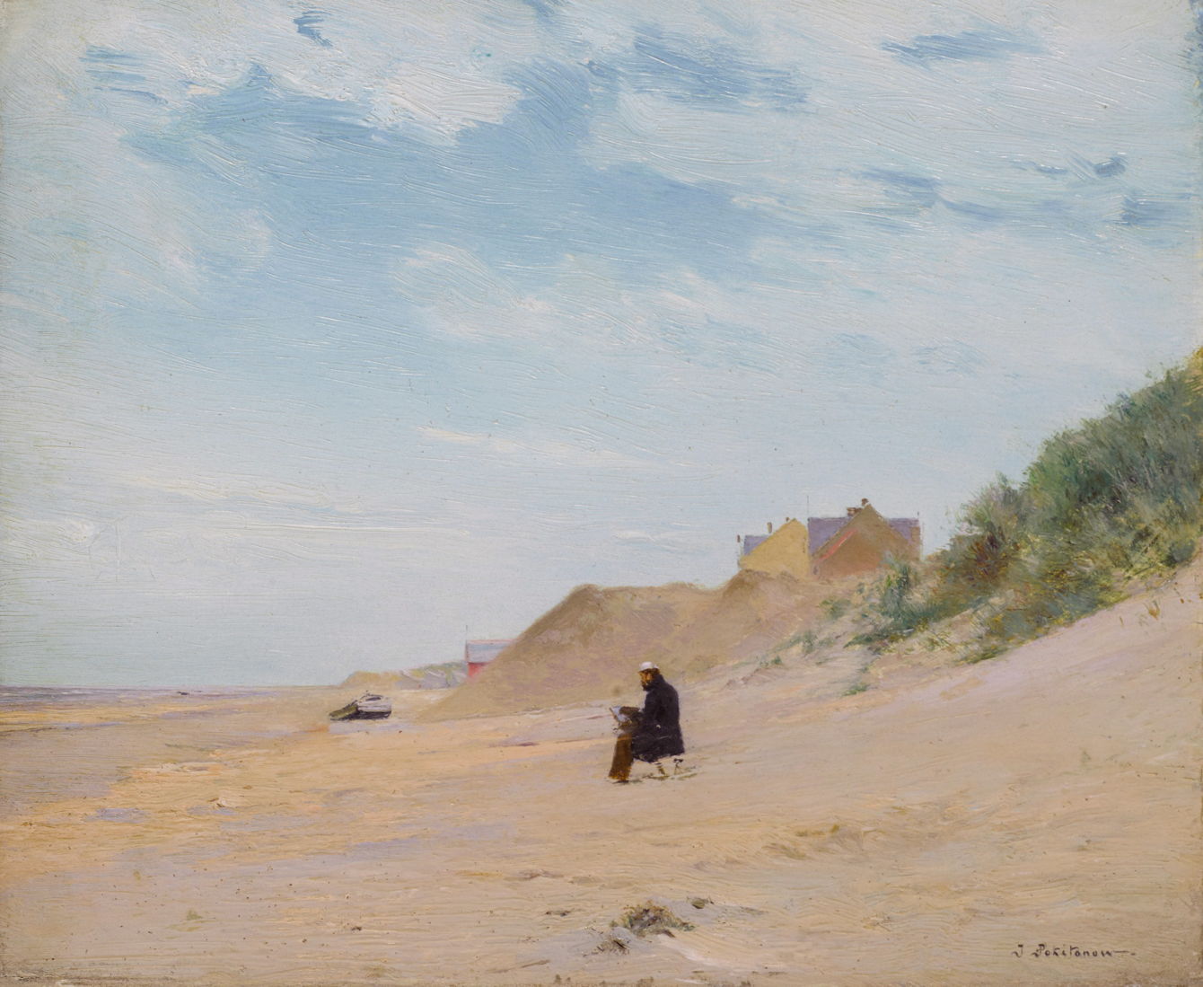 The Artist Painting on the Beach at La Panne shows Pokhitonov painting on the beach of this Belgian resort on the North Sea coast in 1895.
