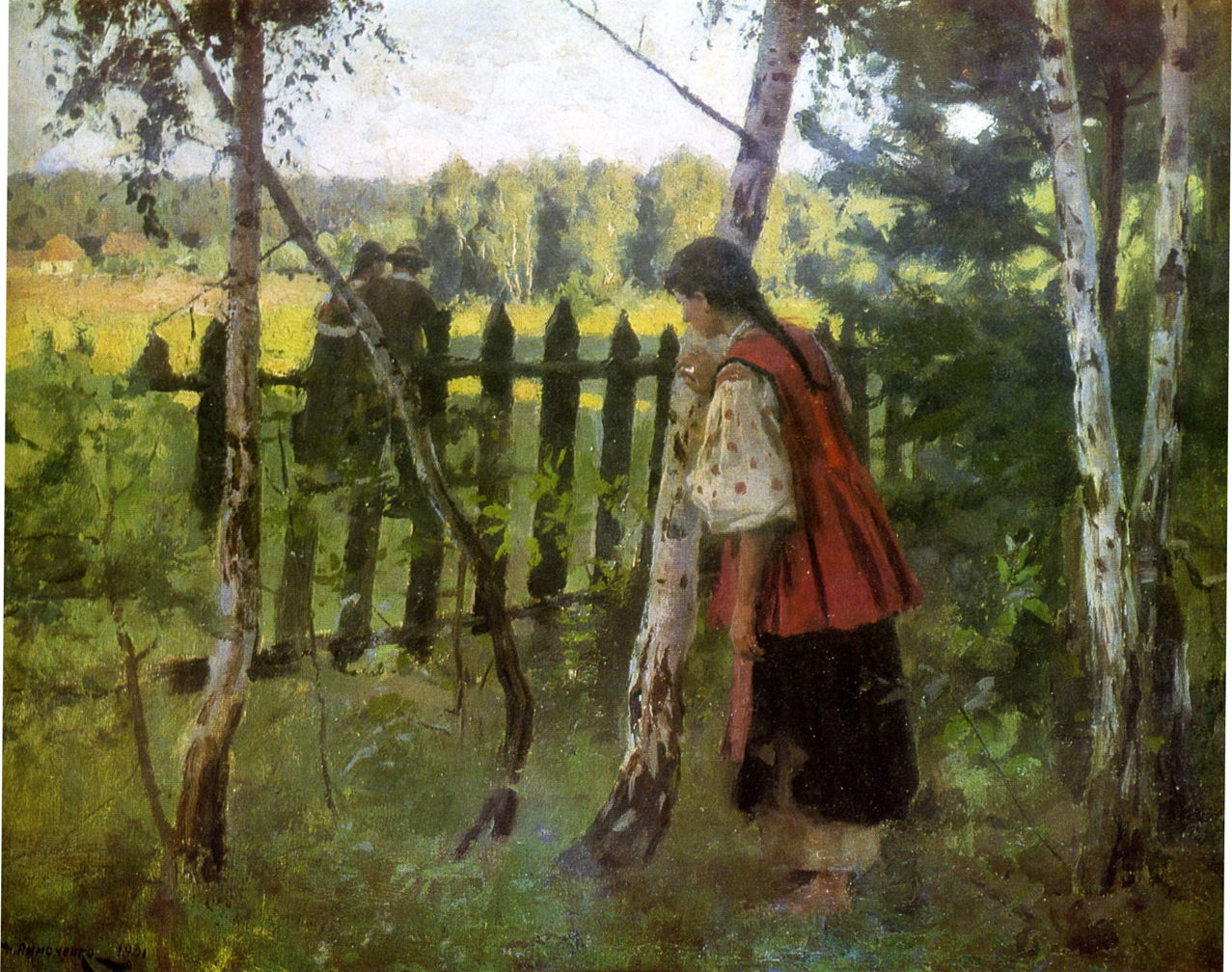 Jealousy (1901) is more sketchy, and shows a jealous woman, perhaps a younger sister, watching a couple as they walk together towards the bright-lit field in the distance.