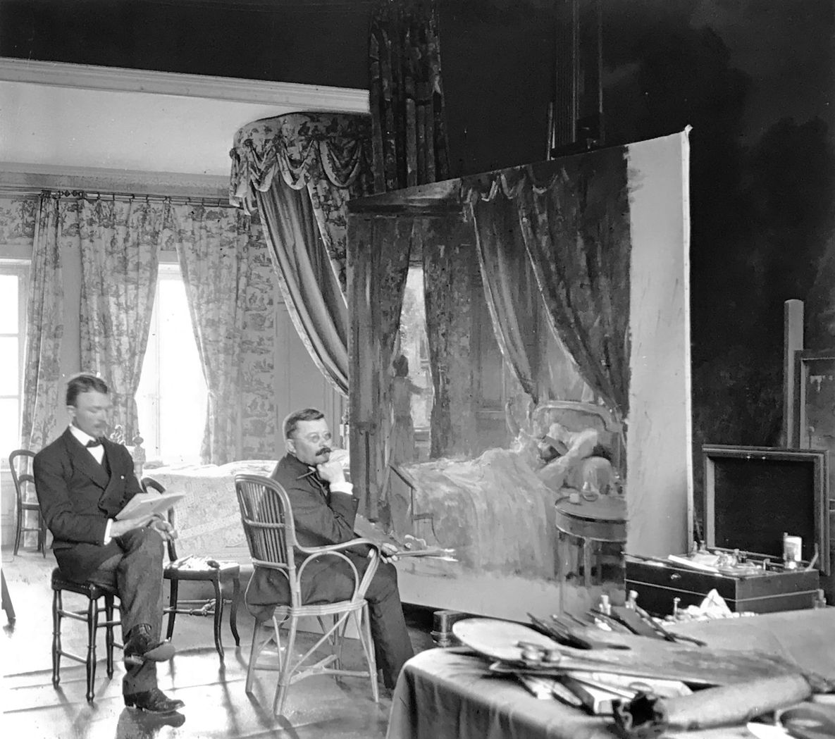 This photograph appears to show Jules-Alexis Muenier painting the huge finished version of Awakening, with his son Pierre behind him. They’re in a beautifully furnished bedroom, which Muenier was using as a studio. His palettes, brushes, and other equipment all give this an air of truth, except that the artist is dressed immaculately in a clean suit, and there are no sheets or other protection on the floor around the canvas. It all looks too neat and clean.