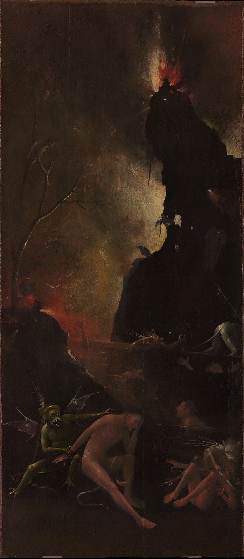 Hieronymus Bosch (c 1450–1516), The River to Hell (panel from Visions of the Hereafter) (1505-15), oil on oak panel, 88.8 x 39.6 cm, Museo di Palazzo Grimani, Venice. Photo Rik Klein Gotink and image processing Robert G. Erdmann for the Bosch Research and Conservation Project, via Wikimedia Commons.
