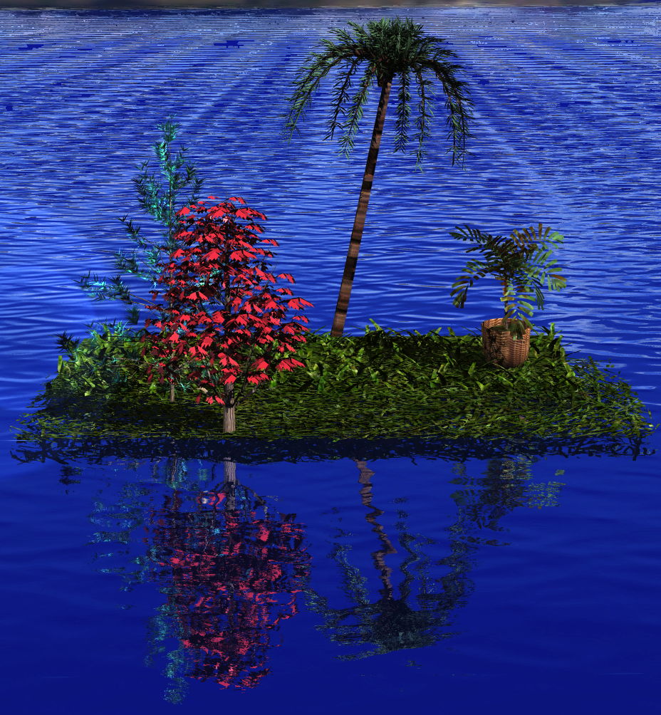 Reflections in a more complex 3D scene, above, show slight alteration in vertical dimensions, but remain strictly aligned with the original. Although the slight waves produce very small lateral displacements in the reflection, every point in the reflection corresponding to a point in the original remains in alignment across the width of the image.