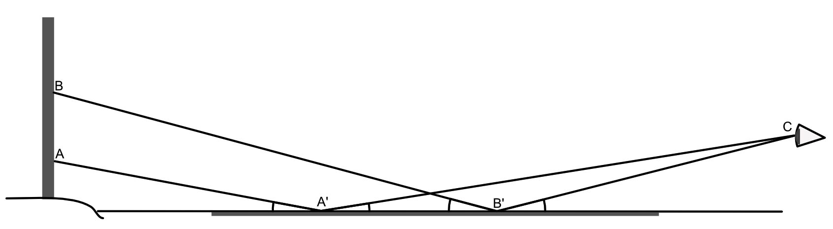 Here a post (with marks A and B), on the left of the diagram, is on the bank of a completely flat lake, with the observer on the opposite side of the lake at C, looking over the lake towards the post. A ray of light scattered from point A on the post passes over the lake to point A’. There, in passing from air to water, it reaches a boundary between media of different refractive indexes, and most of that light will then be reflected towards the observer at C.