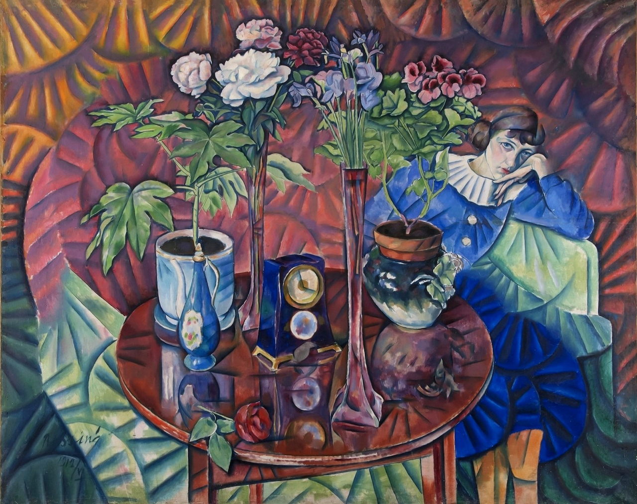 Cousin with Flowers from 1912 is set against a decorative background of colour wheels.