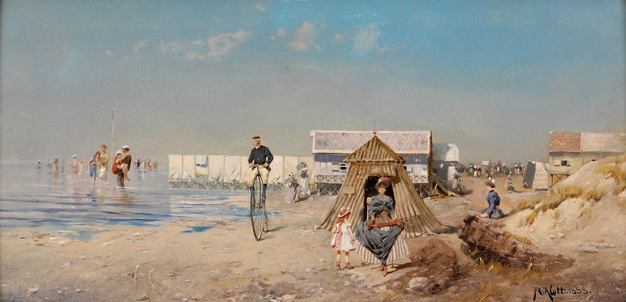 Manet’s remarkably early oil sketch Le Vélocipédiste (The Cyclist) from 1871 is probably the first depiction of a cycle by a major painter. Others like Robert Alott followed, still on their ‘penny farthings’ On the Beach at Ostende (1888), below.