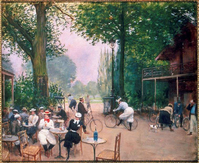 When Cycle Madness broke out in Europe, races started to take place in city parks, and cafés were converted to cater for the wheeled customer. Jean Béraud shows this in his Cycle Hut on the Bois de Boulogne, probably painted around the turn of the century. The Tour de France, the greatest and most demanding sporting event in the world, started in 1903, originally as a ploy to increase sales of a newspaper. Apart from short breaks forced by two World Wars, it has run annually ever since. In its modern form, competitors all cover around 2,200 miles (3,500 km) over twenty-one days of racing.