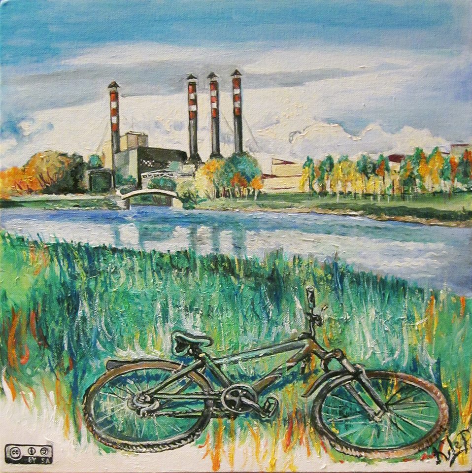 My last painting, though, is very recent, long after painting bikes had become commonplace. Sviatlana Jermakovič’s The Road to Serabranka District (2013) not only stars the bike in its foreground, but claims to have been the first artwork marked with the distinctive CreativeCommons license: one of this century’s innovations.