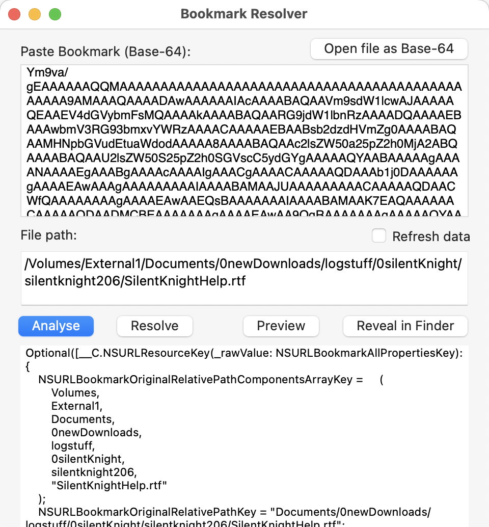 Click on the Resolve button and Precize shows the path to the file both as a normal URL and using the volfs file system. If the Bookmark has been successfully resolved, the Preview button shows that file in a QuickLook preview, and you can see the file in a Finder window using the Reveal in Finder button.