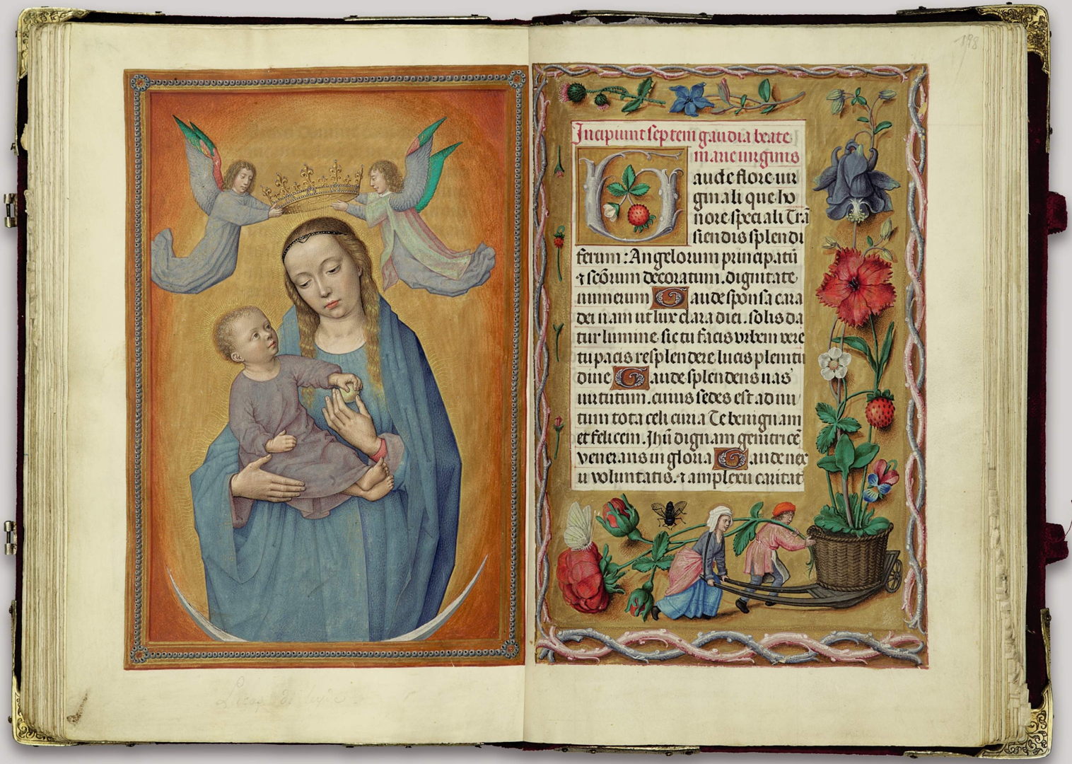 His exquisite miniature of the Virgin and Child on a Crescent Moon was probably painted in around 1510 for what’s now known as The Rothschild Prayerbook or the Rothschild Hours, which was compiled from the work of several artists between 1500-1520. This is another example of the unusual association of the Virgin Mary with a crescent moon.