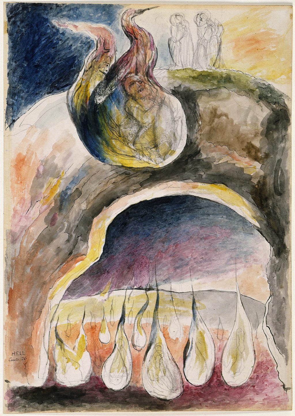 Blake shows Odysseus wrapped in flame, which is brought to a beak-like tip at the top of the painting, giving it the appearance of a bird like a heron. Perhaps that was the same bird that dropped the poisonous spine on the head of Odysseus?