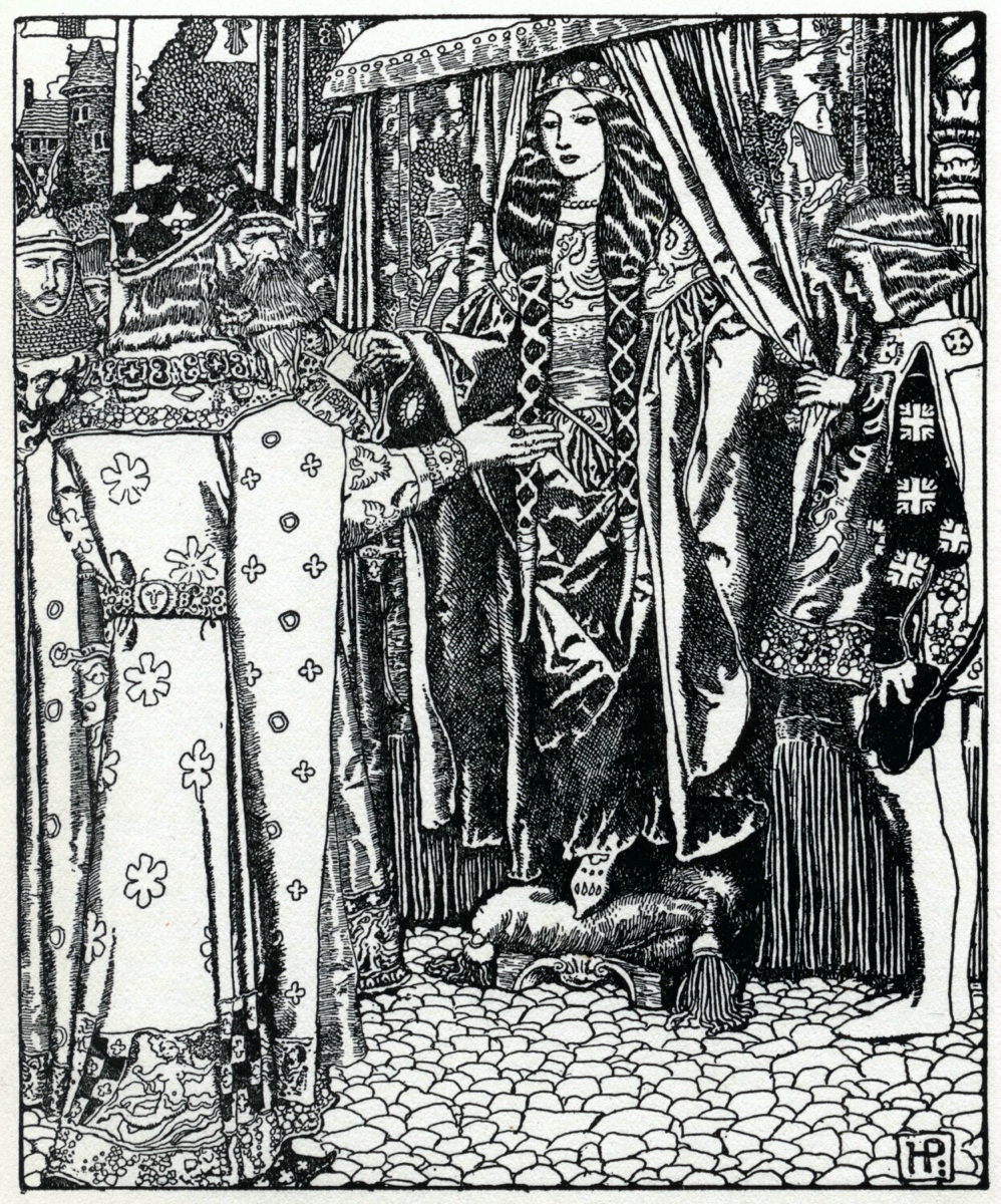 More controversial is Eleanor Fortescue-Brickdale’s Uninvited Guest from 1906. Although this is normally read as referring to marriages of convenience, contracted for wealth and status rather than for love, some hold that it shows the marriage of Guinevere and Arthur. The guest referred to is the winged figure of Cupid, in the right foreground with his quiver of arrows, who could be a reference to the future adulterous relationship between Lancelot and Guinevere.