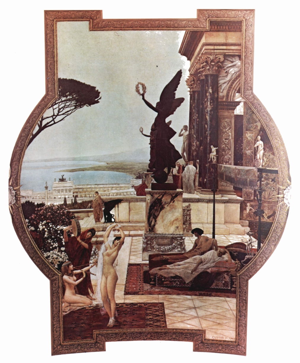 In 1887, the Kunstlercompagnie was commissioned to paint the walls of two large staircases in Vienna’s newly-built theatre. Among the theatrical scenes believed to have been painted there by the young Gustav Klimt is Theatre at Taormina, which was completed for its opening by Emperor Franz Joseph I in 1888.