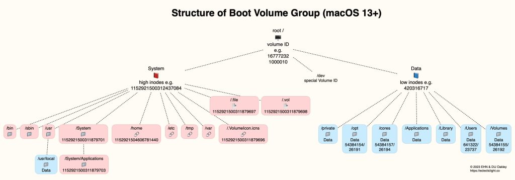 The boot volume group was introduced to macOS in Catalina and Big Sur, and has since stabilised as an architectural feature that still catches us out. This article looks in detail at how the firmlinked System and Data volumes appear in the file system in Ventura and Sonoma, to help you navigate them.