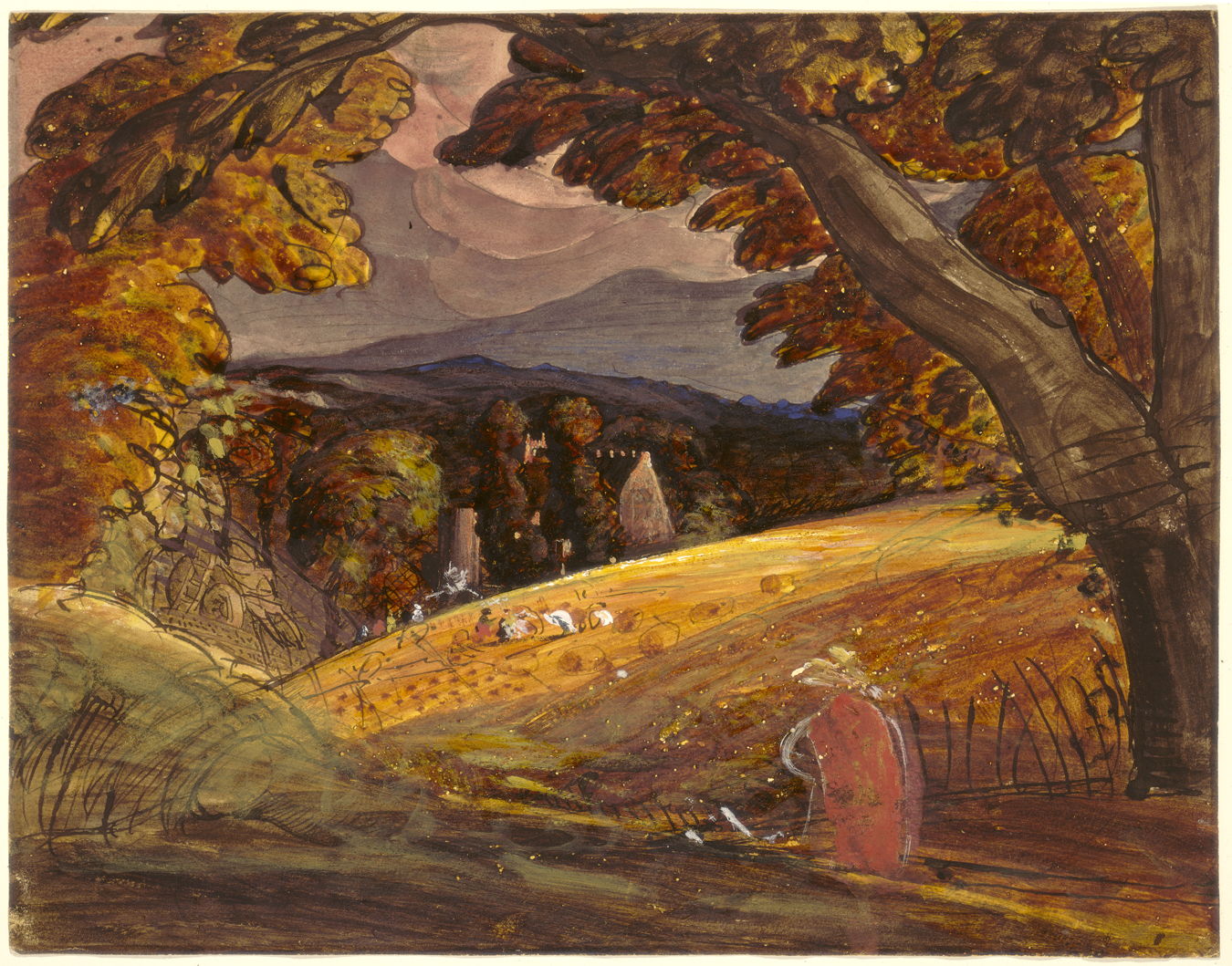 Samuel Palmer (1805–1881), The Gleaning Field (c 1833), tempera on mahogany, 30.5 x 45.4 cm, The Tate Gallery (Bequeathed by Mrs Louisa Mary Garrett 1936), London. © The Tate Gallery and Photographic Rights © Tate (2016), CC-BY-NC-ND 3.0 (Unported), http://www.tate.org.uk/art/artworks/palmer-the-gleaning-field-n04842