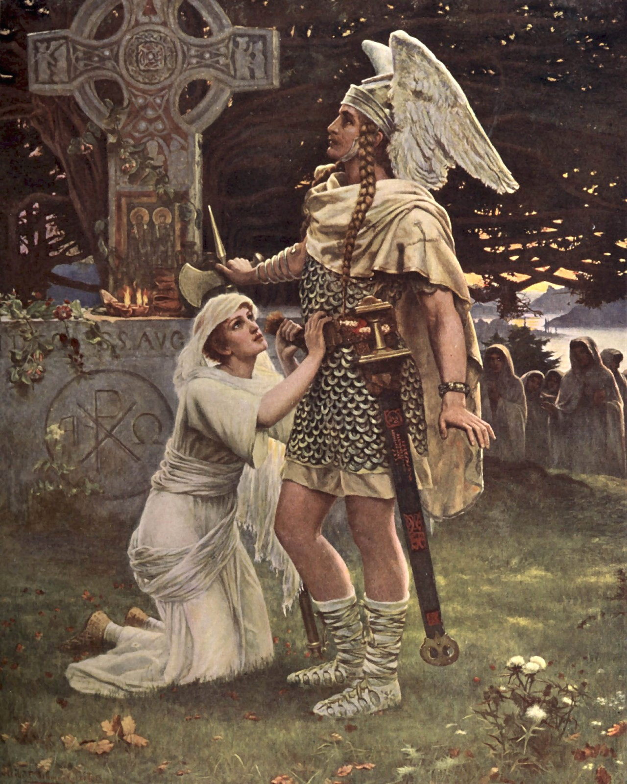 Herbert Gustave Schmalz’s Sir Galahad from 1881 may show Sir Perceval’s sister fitting the knight with his sword and scabbard, for which she made a girdle or belt.