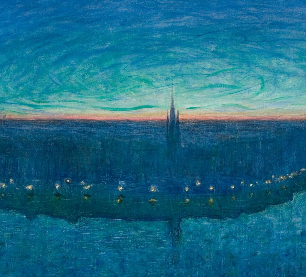 Meanwhile, in Stockholm, another specialist low-light artist Eugène Jansson was painting the capital in his Dawn Over Riddarfjärden from 1899. His soft squiggles of darker colour in the water become better defined in the sky, where they swirl calligraphically along the horizon.