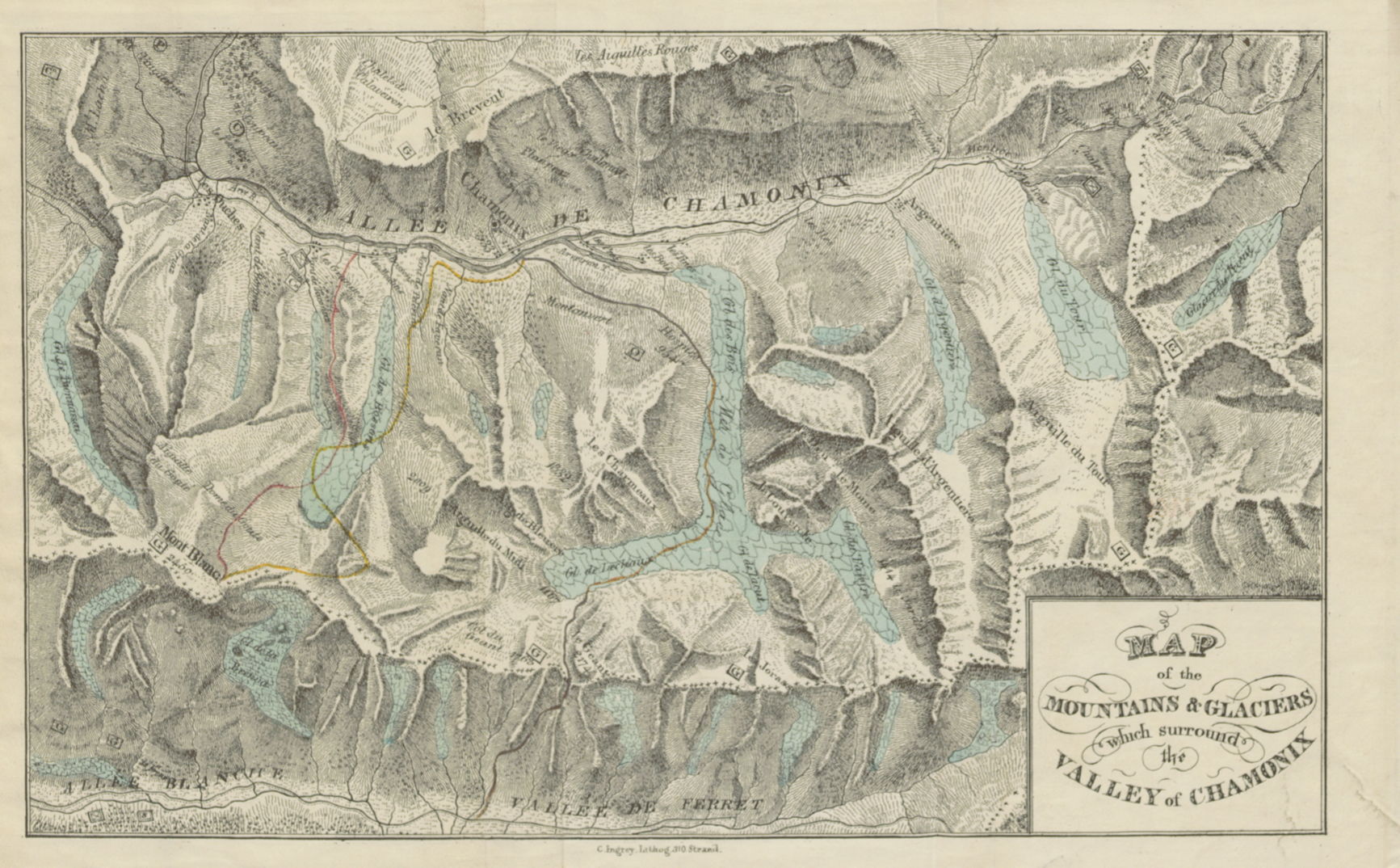 Auldjo approached his objective methodically, producing several detailed pencil and wash views which he carefully labelled. He also provided the drawing for this print of a Map of the mountains and glaciers which surround the valley of Chamonix (1830), which was published in his book, Narrative of an Ascent to the Summit of Mont Blanc, on the 8th and 9th August, 1827. Mont Blanc is at the lower left.