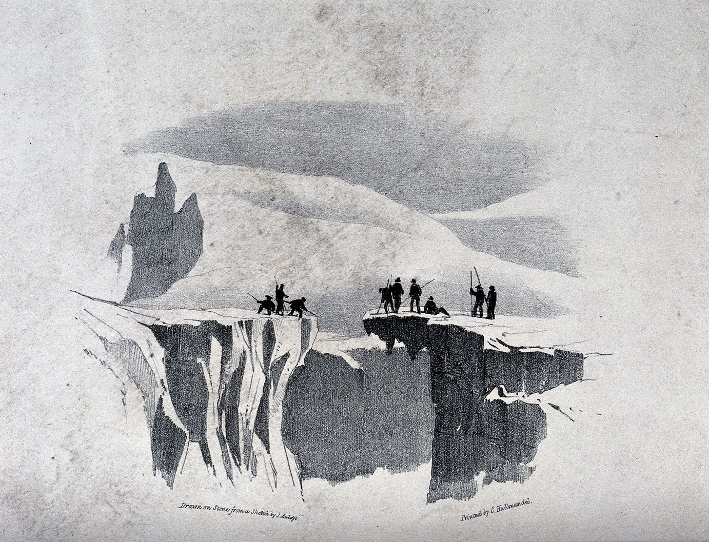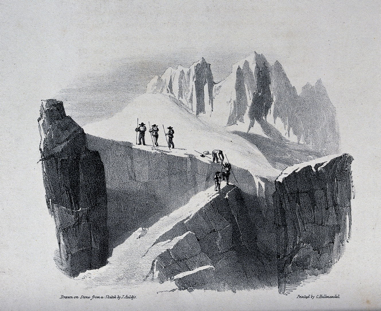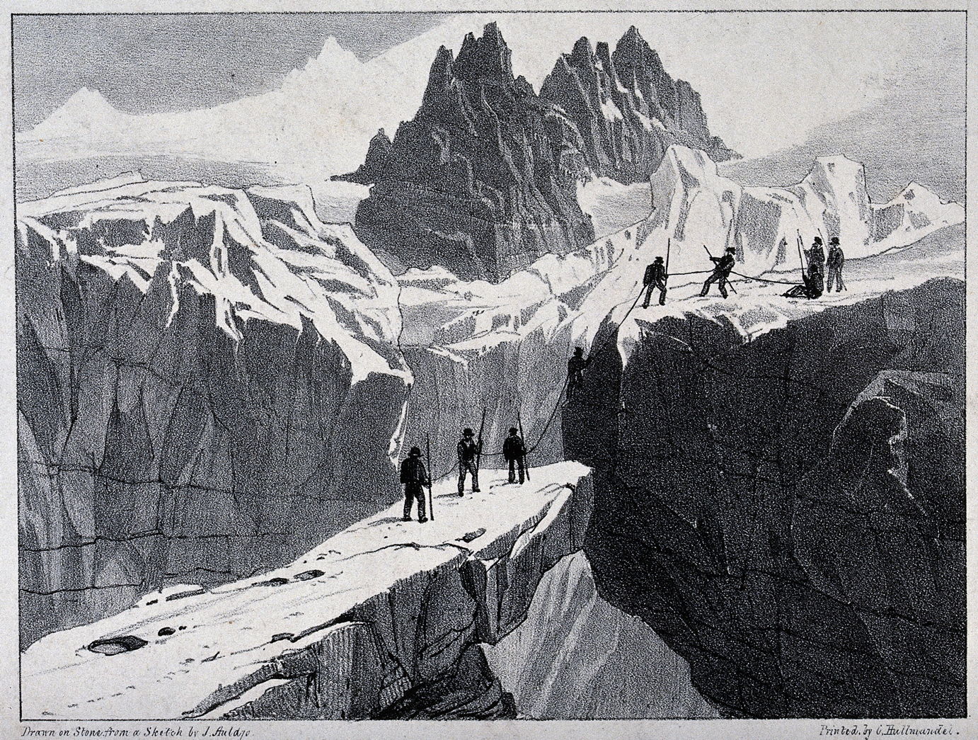 Surviving original paintings are now in the collection of the Alpine Club in London, and formed the basis for this lithograph of Mountaineers Scaling a Wall of Ice above a Precipice in 1828.