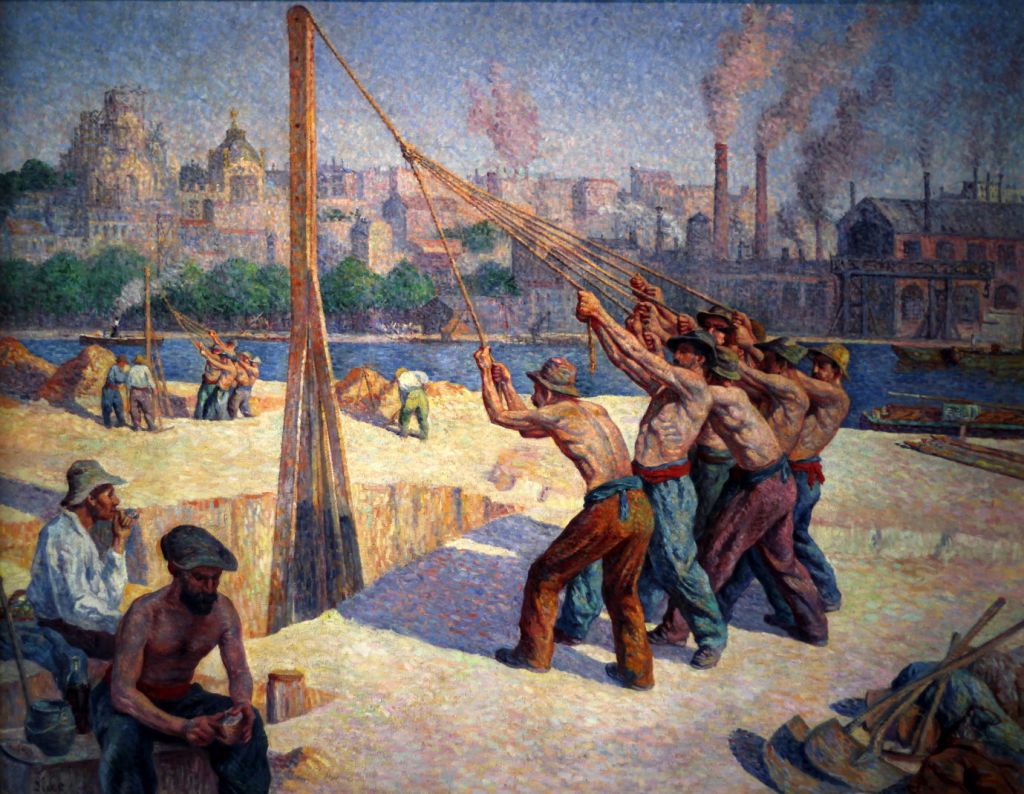 Finally, there are a few paintings that show rope being used for everyday purposes. The Pile Drivers (1902-3) is one of Maximilien Luce’s explorations of the working life of the common man in Paris. Construction work in the French capital continued to be active in the early twentieth century, and these gangs of labourers are pulling on the rope to drive piles into the foundation of buildings on the banks of the River Seine.