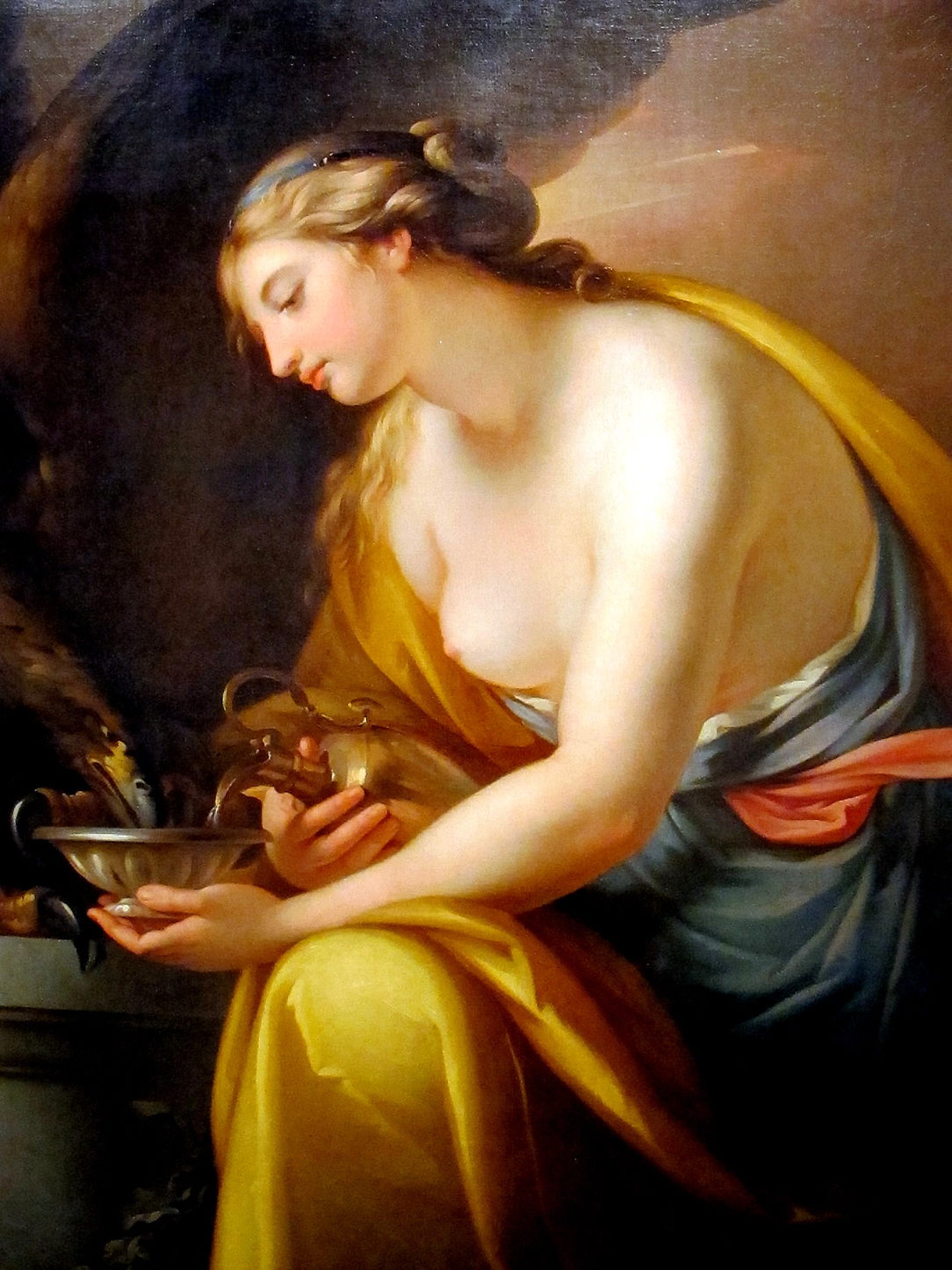 Hebe Giving Drink to the Eagle of Jupiter (1767) shows the Greek goddess of youth, in her role as cup-bearer to the gods, providing ambrosia and nectar to the eagle of her father Zeus.